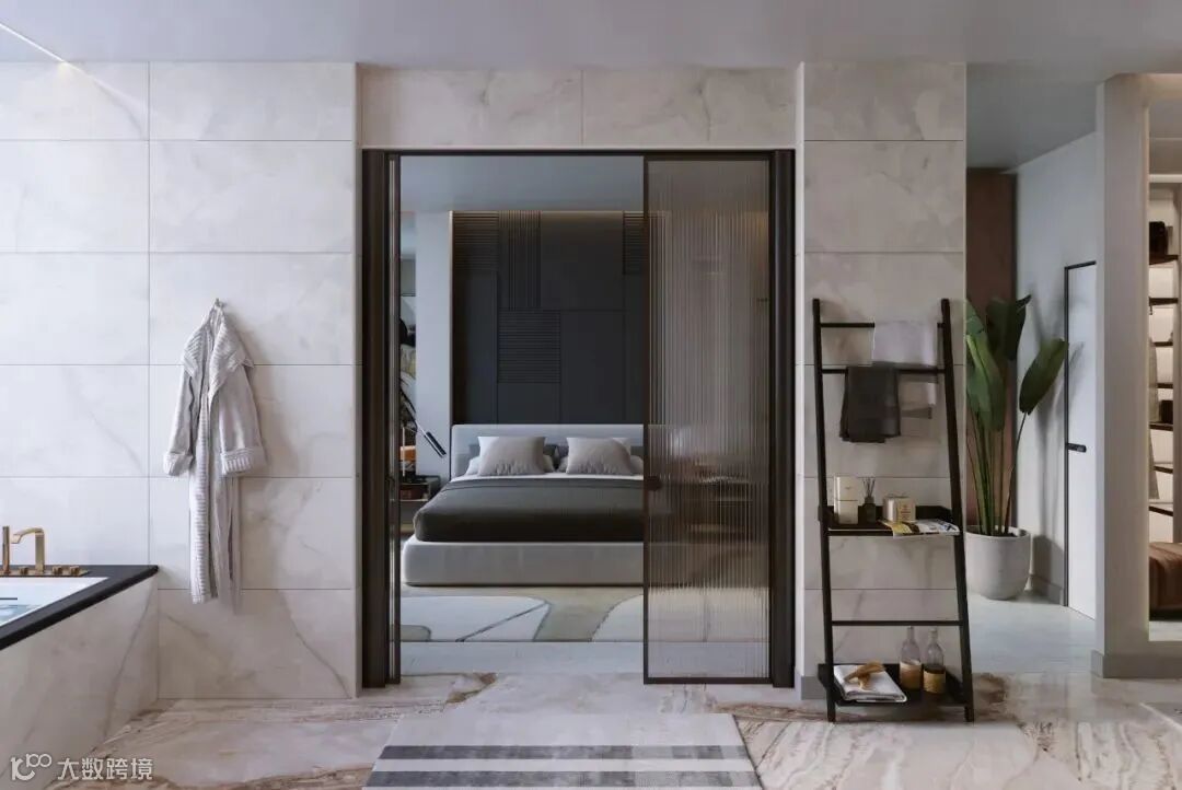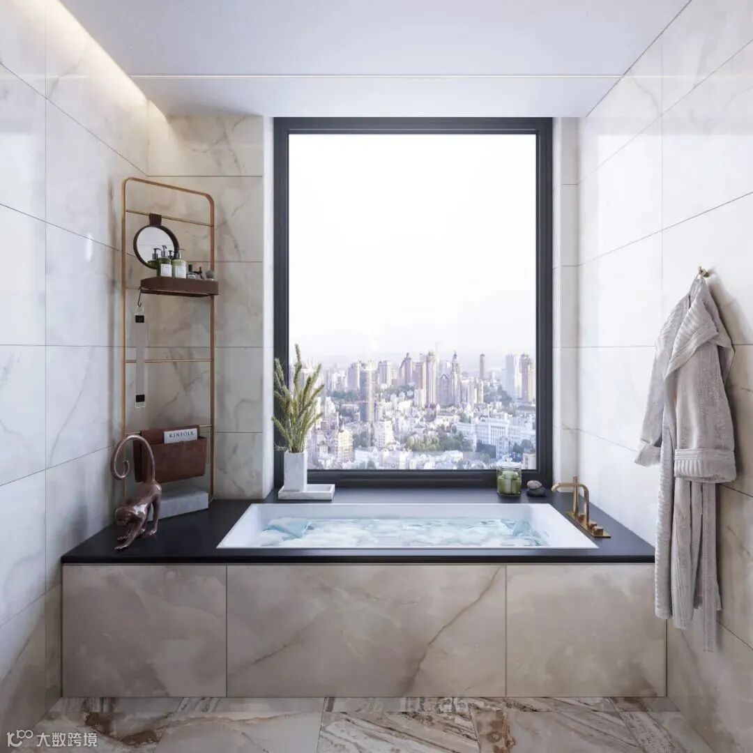 浴室的简约极致,在白棕色大理石肌理感中保持着柔和的理性,浴缸边大胆的落地窗设计将室外自然景观融入空间。