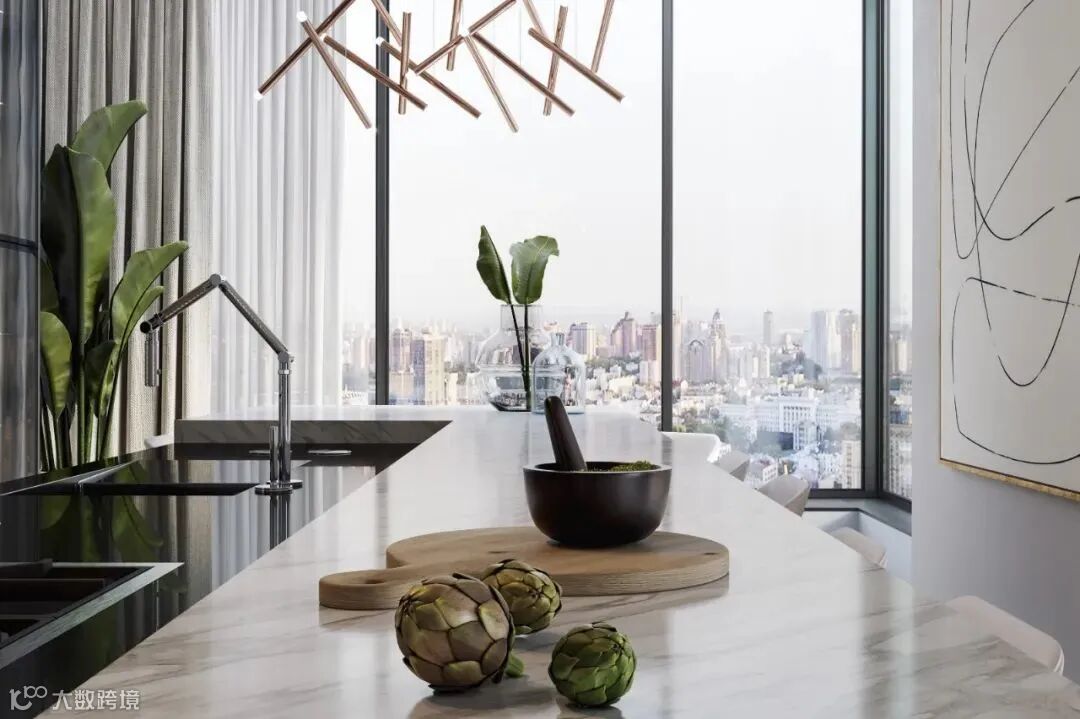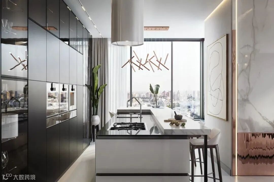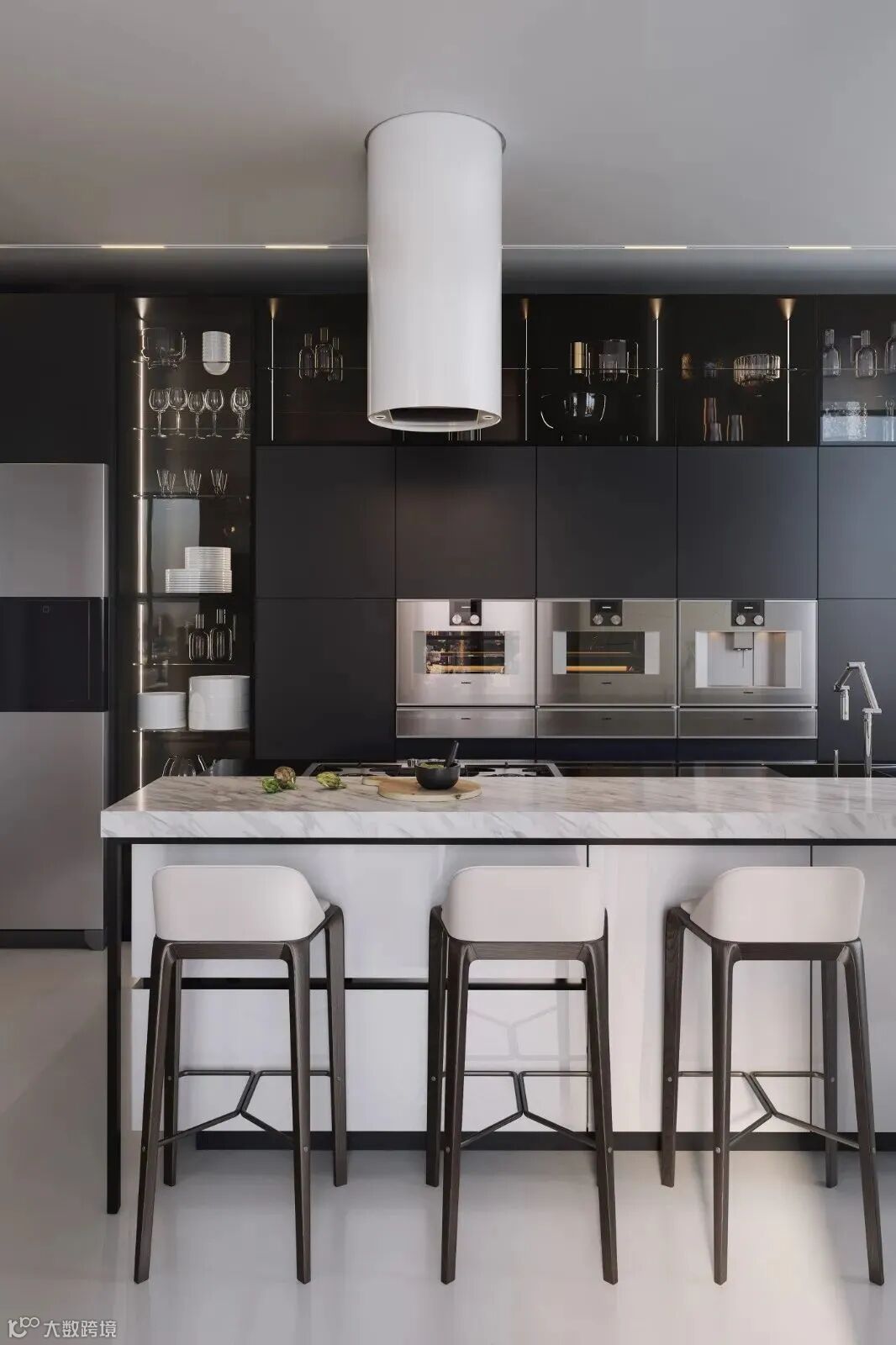 开放式的厨房,黑色橱柜与白色大理石相搭配,时尚的造型加上独有的温馨色调,打造一个充满了舒适感的空间。