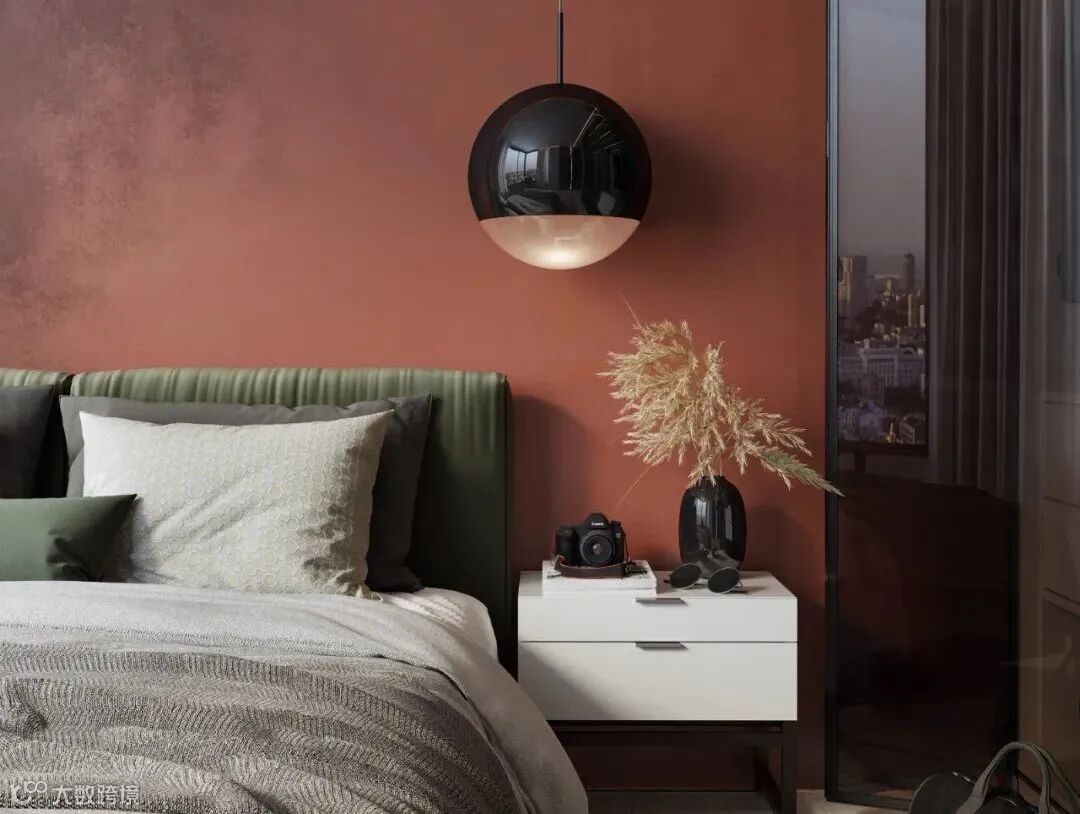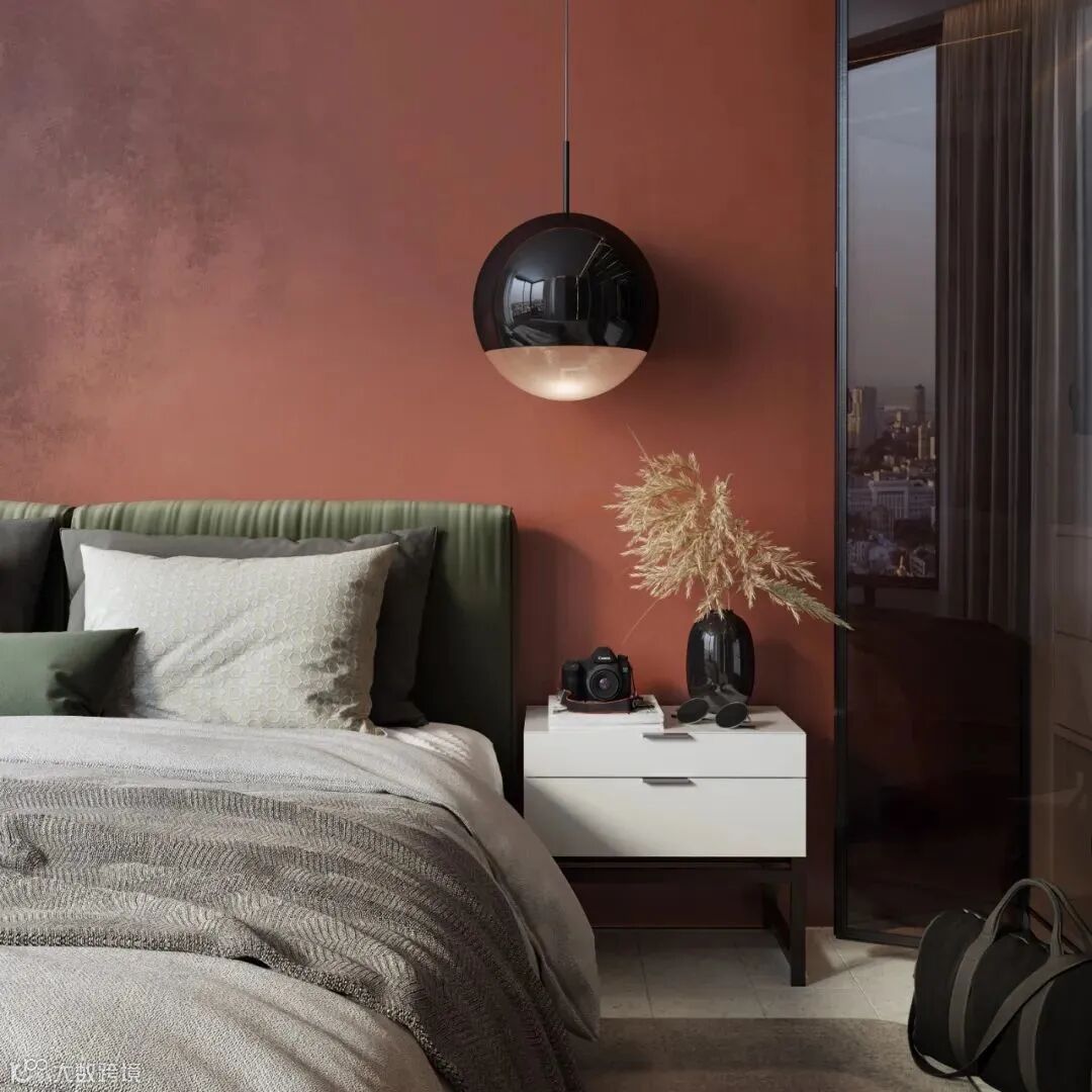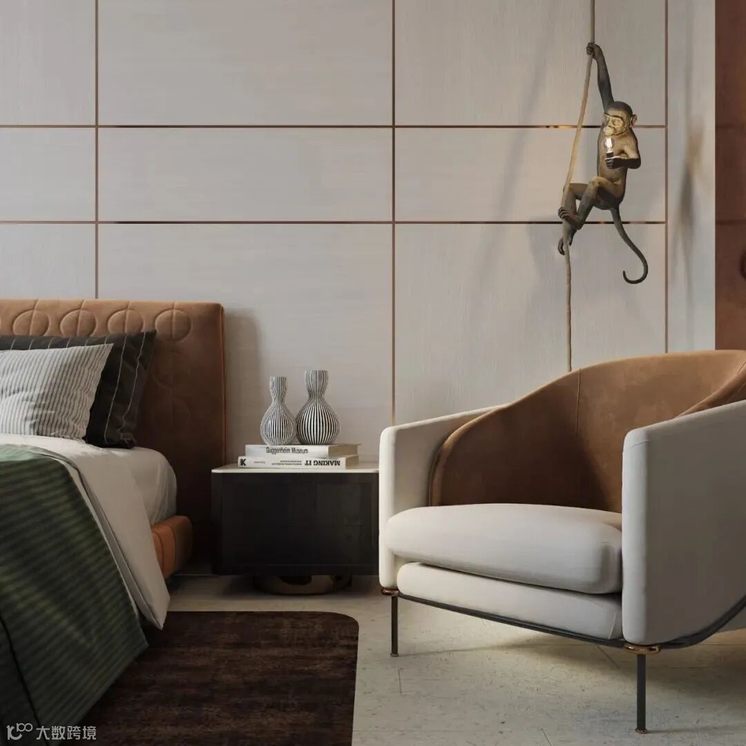 次卧空间里的装饰都被限制在绿色、棕色、白色的调色板上,营造出平静的均匀感和凝聚精致的气息。火了很久的猴子吊灯,极具探索感的为空间增添一丝生机。