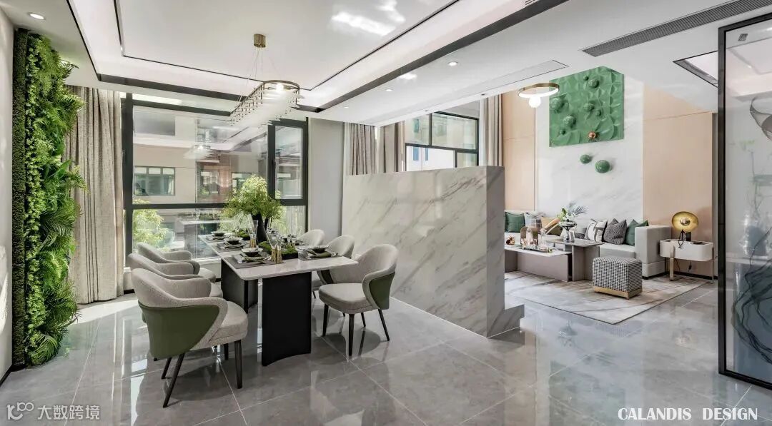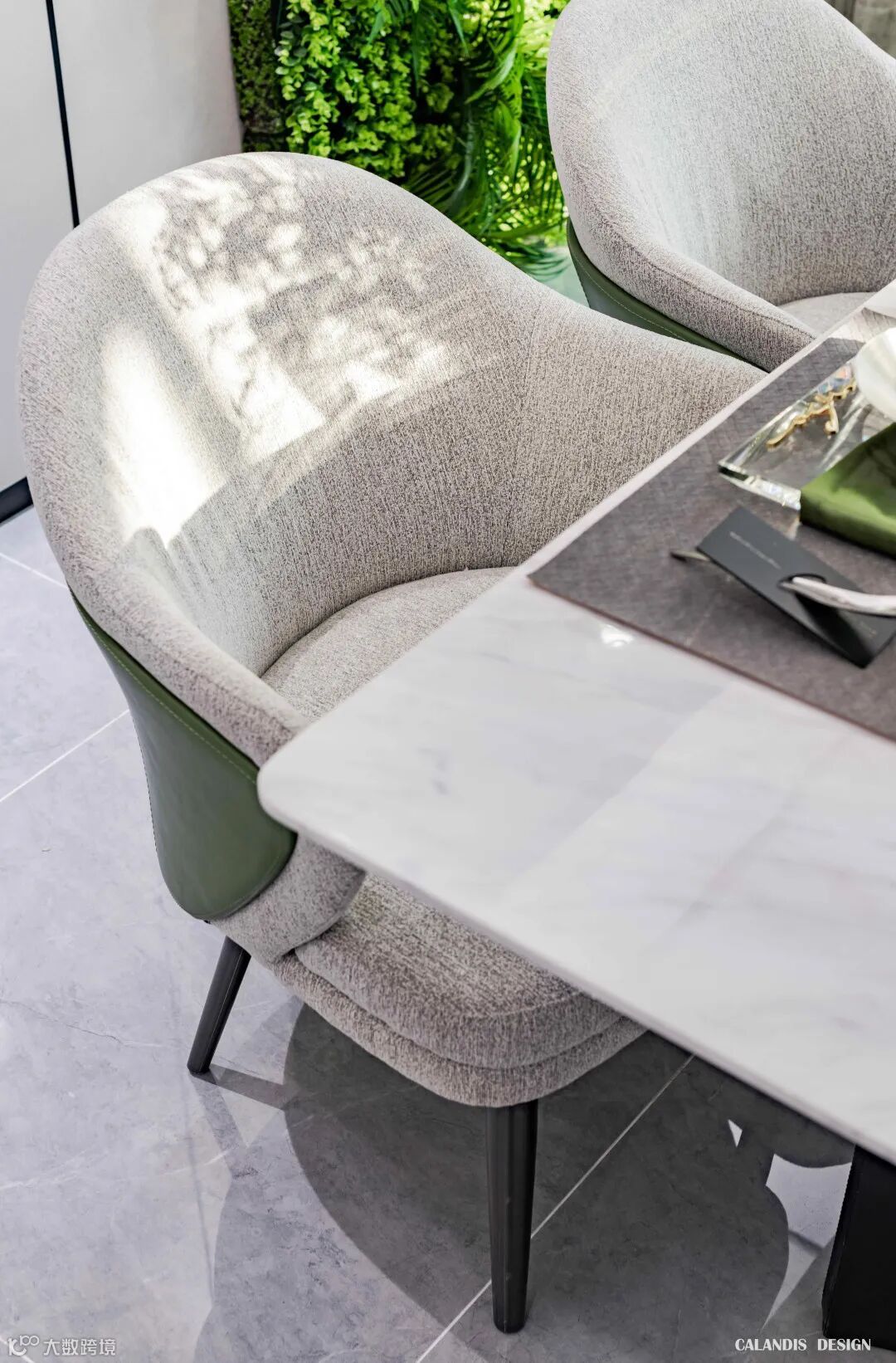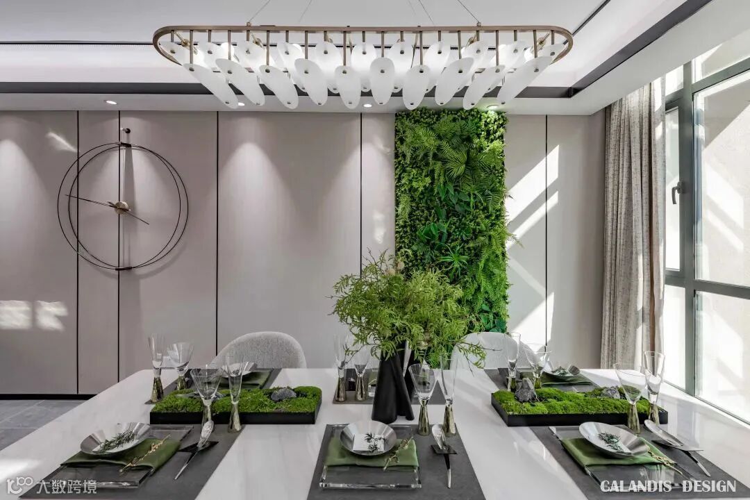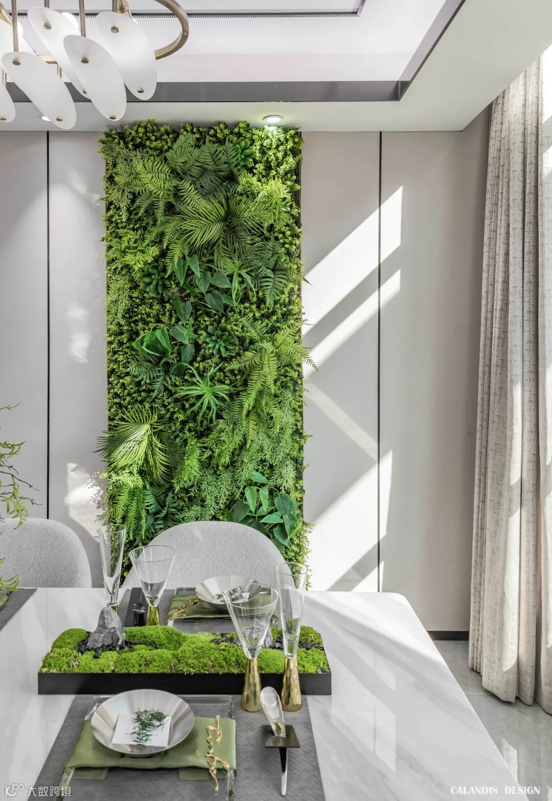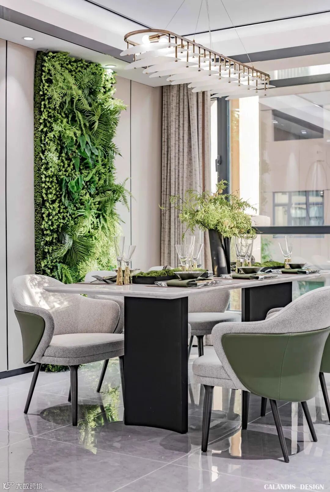 餐厅大幅落地绿植墙给人舒适的观感与用餐体验之余,也很好的承接了客餐厅所延续的生机与绿意。