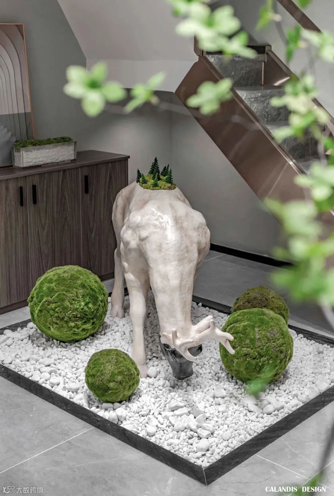 楼梯间“食草鹿”雕塑寓意着吉祥与春意盎然。