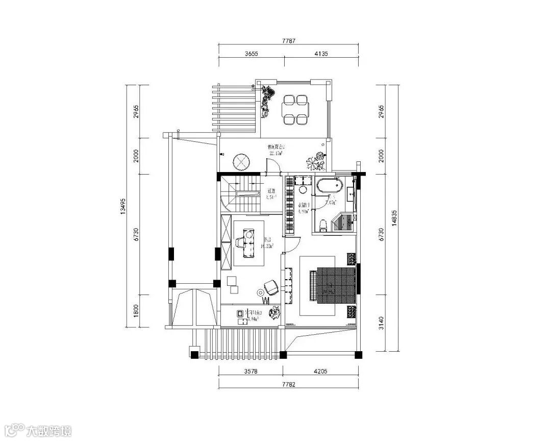 本次设计的是小区别墅区里的一座叠拼户型,二层做了中空设计,设计面积为208 m²。一层为客餐厅、茶室、长辈房,二层为小孩房及客房,三层是主卧室及衣帽间,书房以及休闲露台。
