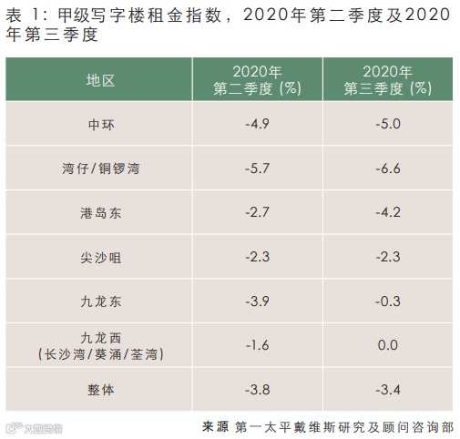 整体空置率由2020年6月的6.02%(355万净平方呎)急升至2020年9月的6.82%(403万净平方呎)。中环及湾仔/铜锣湾的空置率由第二季度末的5.6%及6.3%分别上升至6.8%及7.2%。港岛东空置率虽然由2020年6月的1.9%上升至2.4%,但仍是空置率最低的子市场。除了九龙东外,九龙的空置率同样上升,尖沙咀及九龙西的空置率分别由6月底的4.2%及3.8%上升至6.0%及4.6%。中环及尖沙咀的空置率急升主要是由于主要租户迁出。