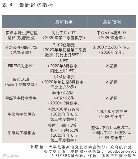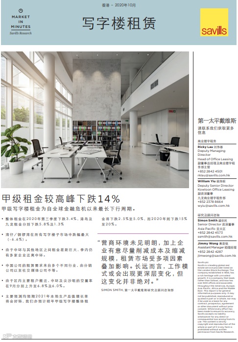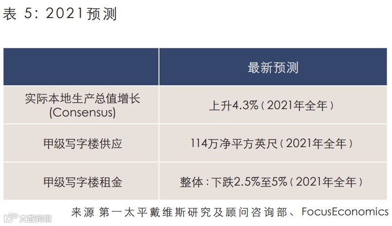 主要的预测者预料经济将于2021年复苏,而根据国际货币基金组织目前预测,明年的实际本地生产总值将上升3.9%。预测数位主要假设疫情成功受控、中美关系的未来方向清晰,以及社会跌序得以维持。另外,三个非核心地区甲级写字楼发展专案将会落成,预计为2021年甲级写字楼市场提供114万净平方英尺供应。根据以上较乐观假设,我们预期年甲级写字楼租金将轻微下跌2.5%至5.0%。