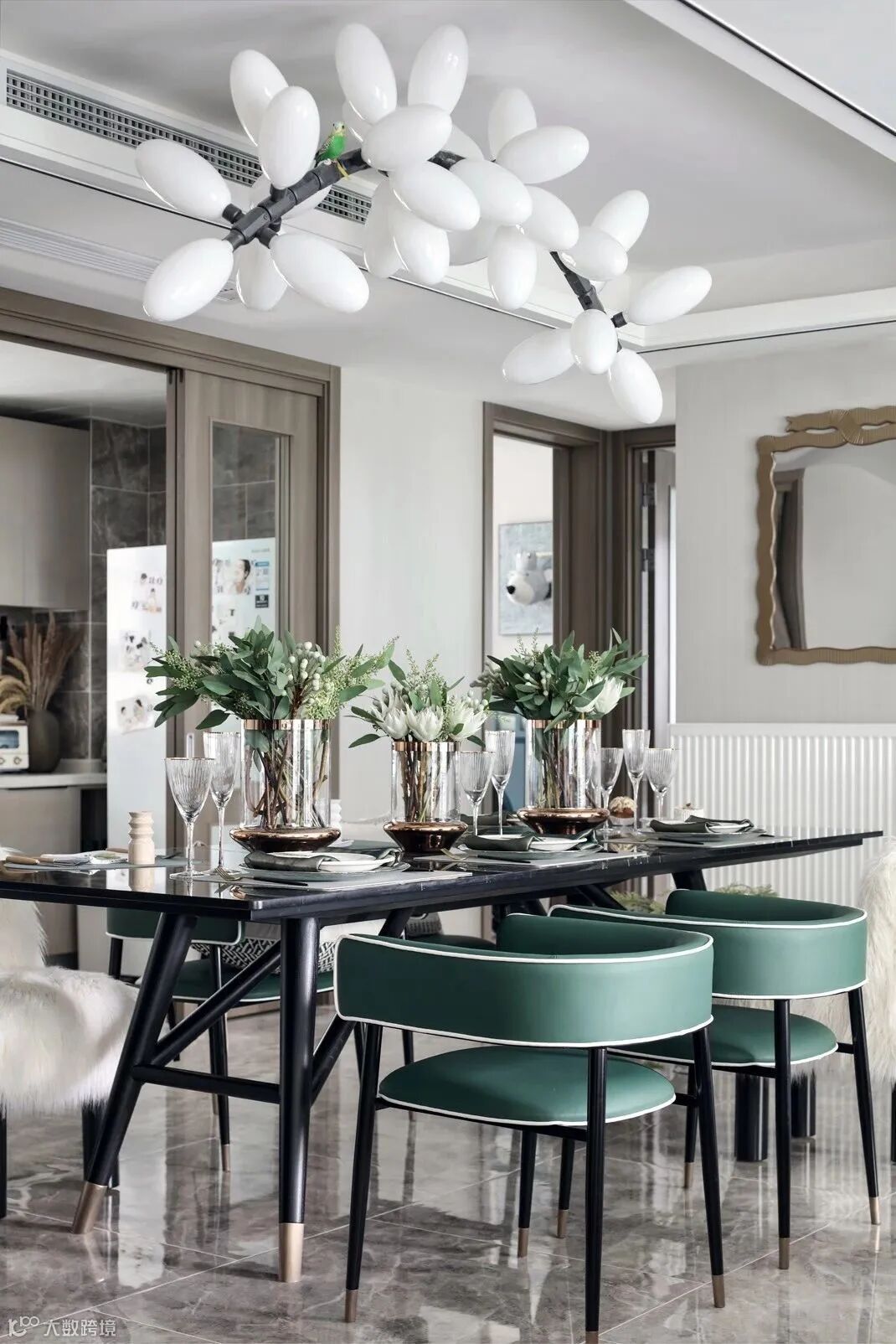 餐厅的皮餐椅延续客厅的绿色