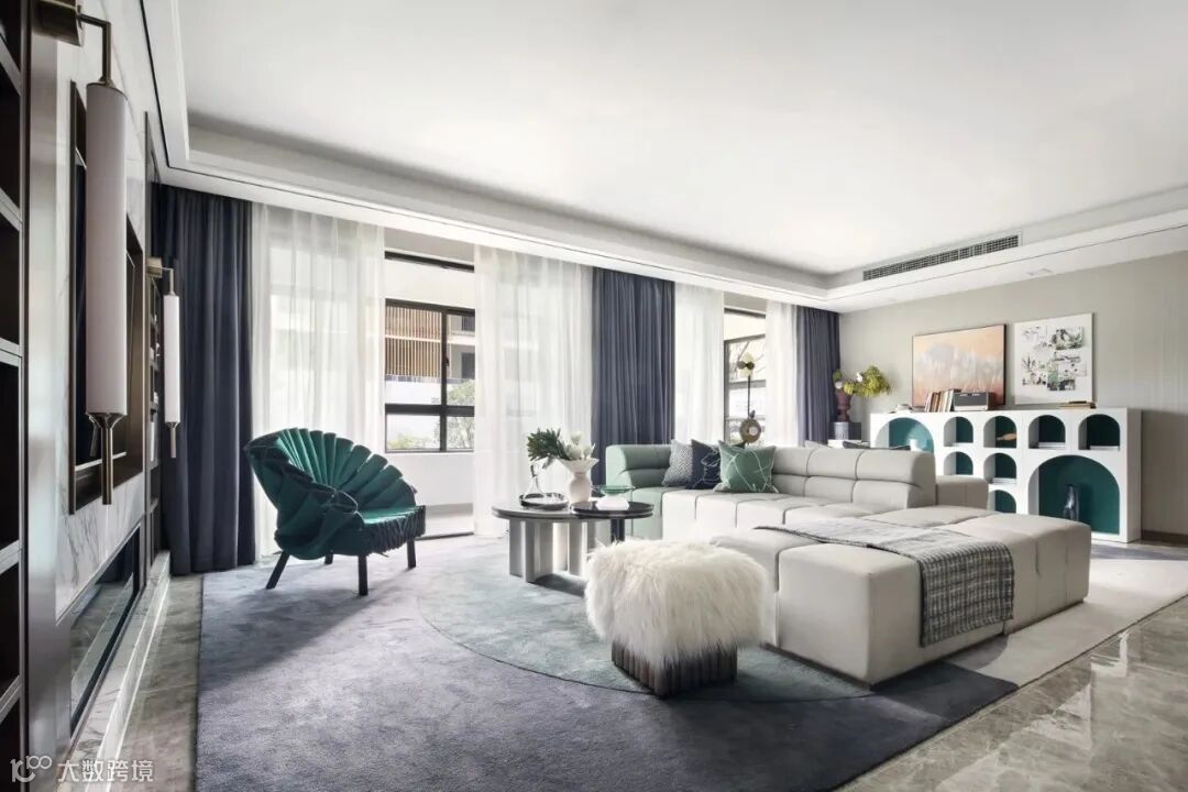 灰白交织的地毯与主位沙发形成对比与延伸