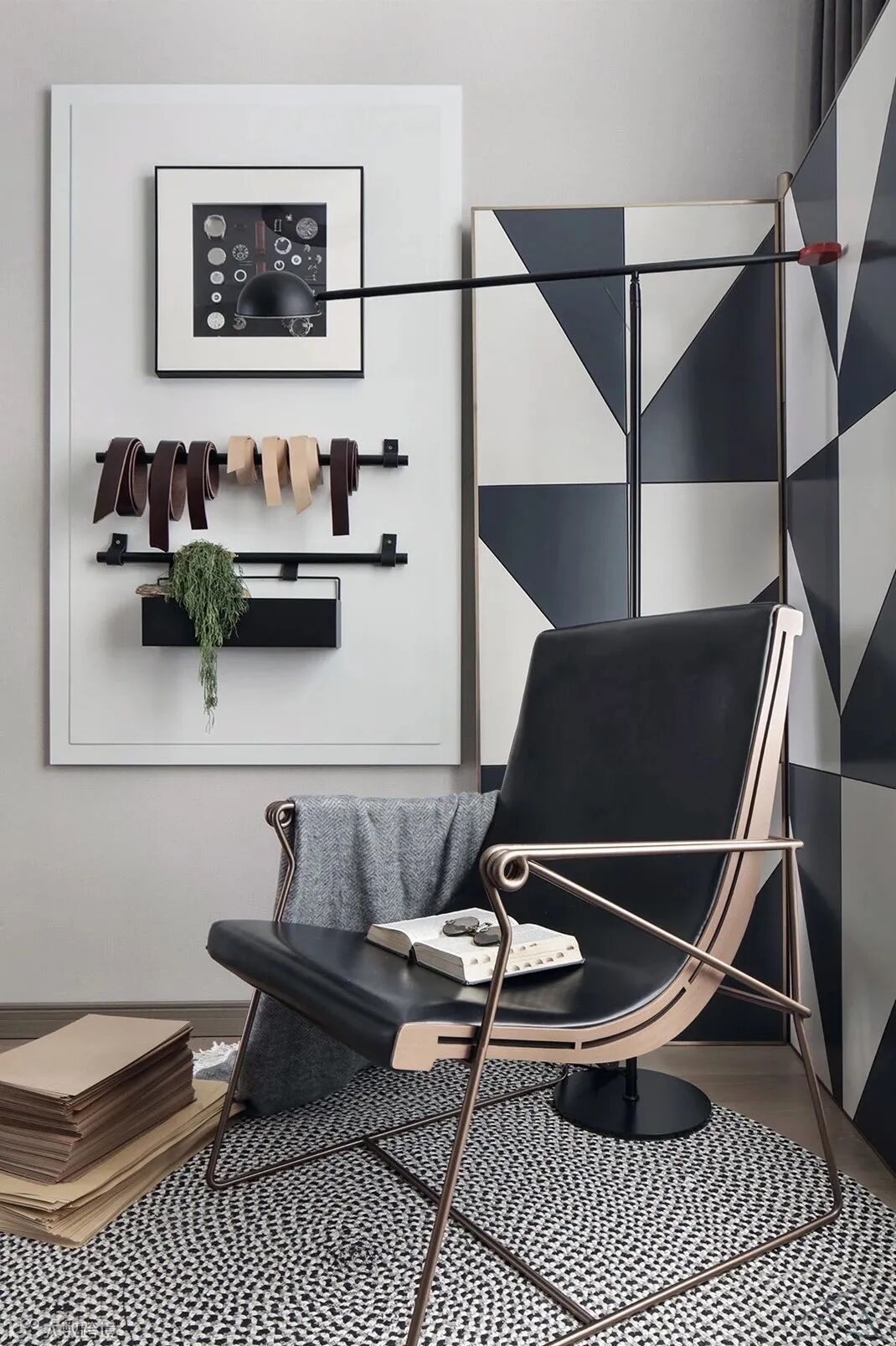 格栅条背景墙、圆环造型床头灯、黑白格纹地毯