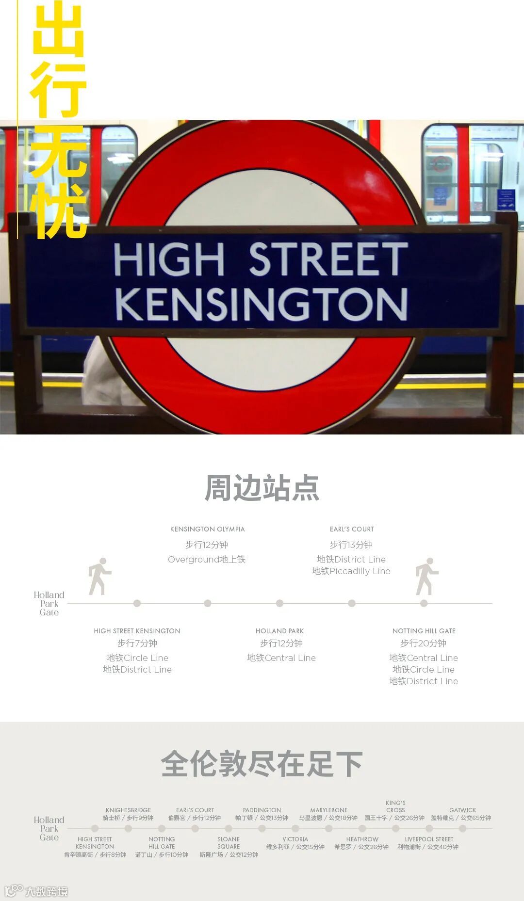 项目周围共有4条地铁线路、1条地上铁线路环绕,其中最近的High Street Kensington地铁站仅7分钟步行距离,还有另外多个站点可选,帕丁顿、国王十字、利物浦街(伦敦金融城)、希思罗机场等目的地快速可达,心之所想、步之所及!