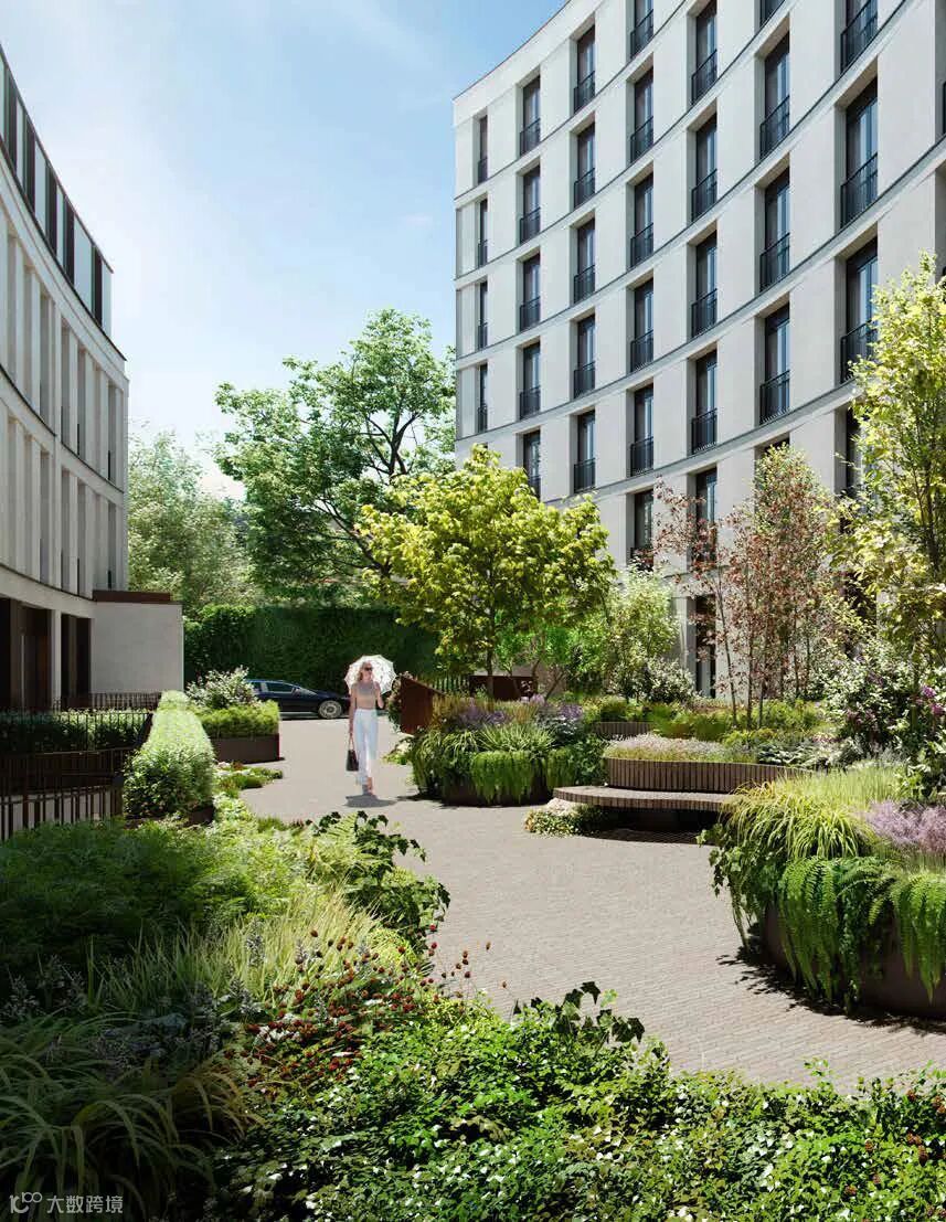 四栋大楼环绕着由屡获大奖的园林景观设计事务所Andy Sturgeon操刀的中庭花园,从视觉观感、生活体验、精神享受等各个层面来看,都是Holland Park Gate的灵魂所在。樱桃树、橄榄树等绿植掩映之下,是伦敦市中心喧嚣生活中难得的一方心灵净土。