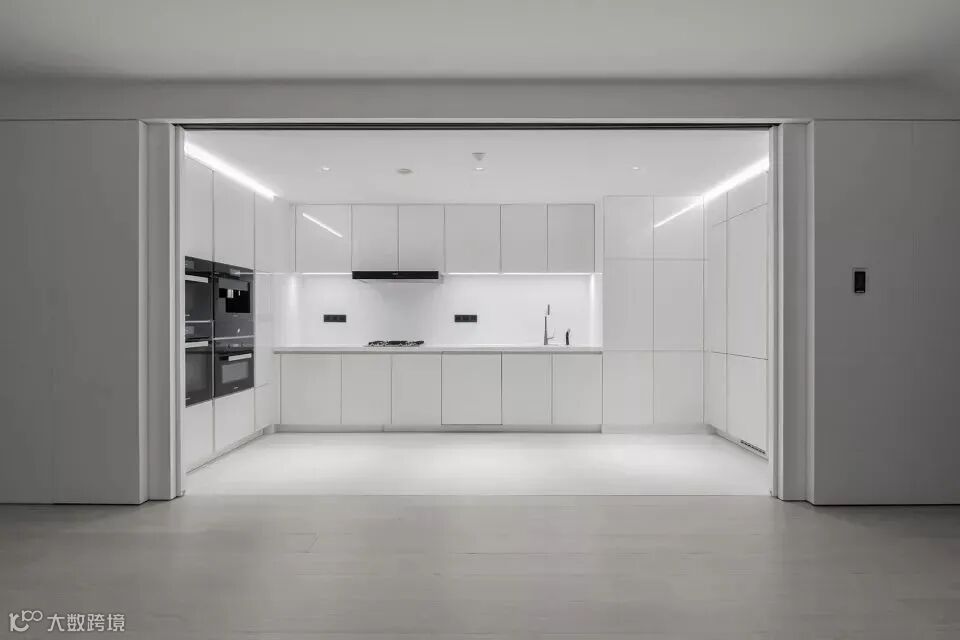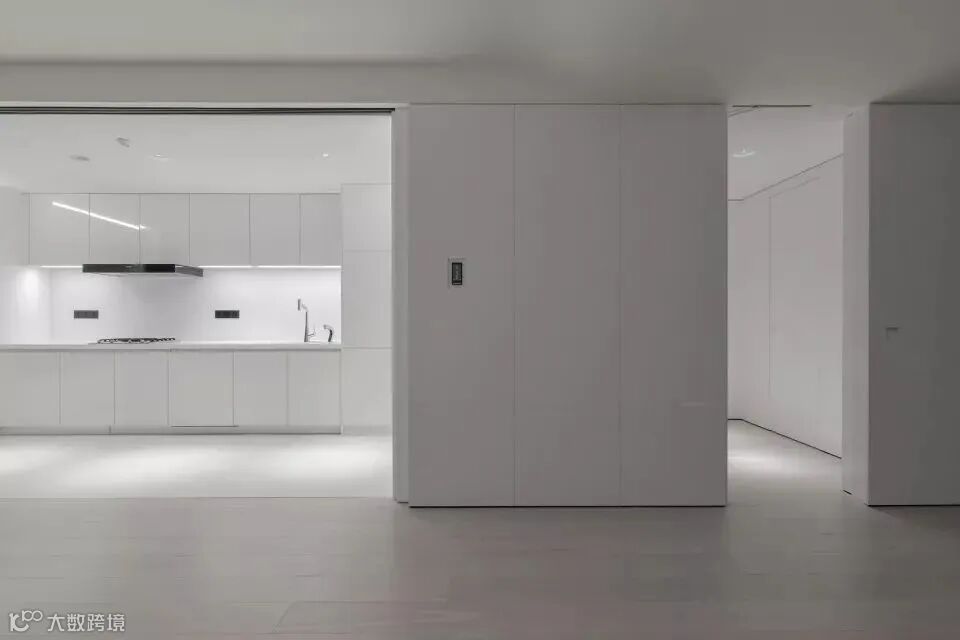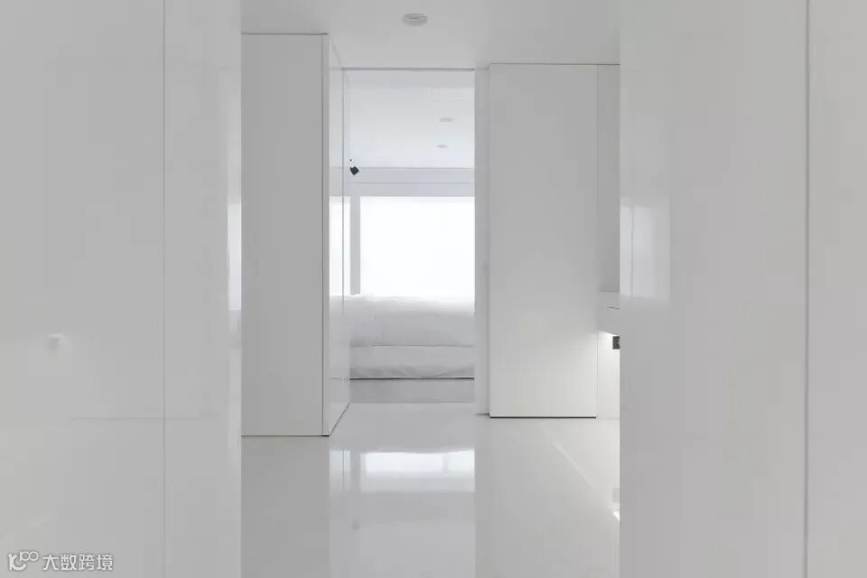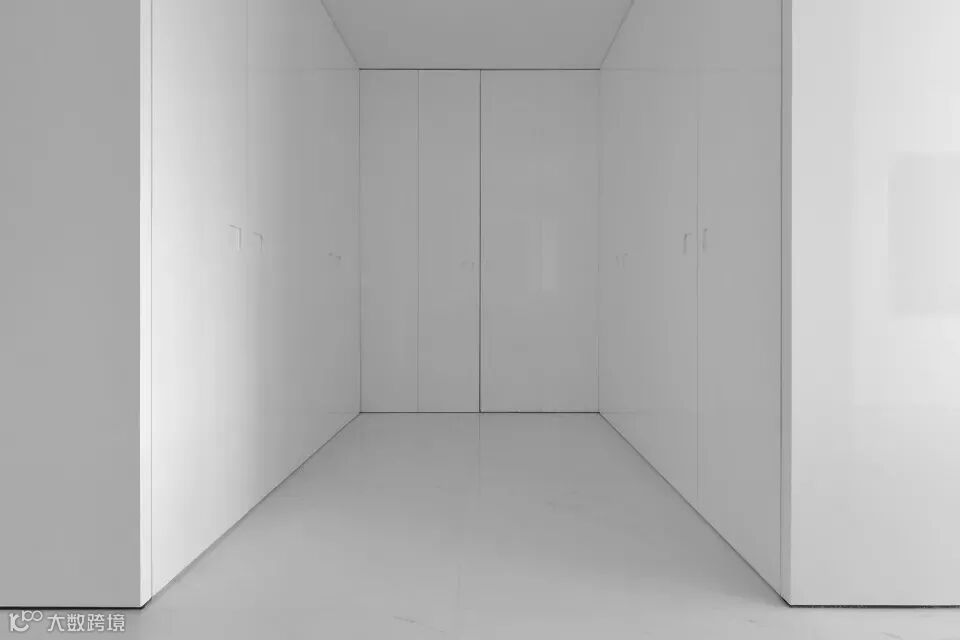 BBC有点轻度洁癖,目之所及没有其他任何杂物;墙面上能看得到的都是柜子,加起来有87㎡,储物空间占了整个家将近一半的空间。