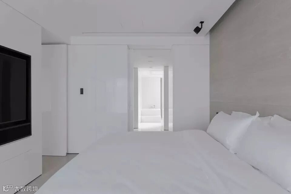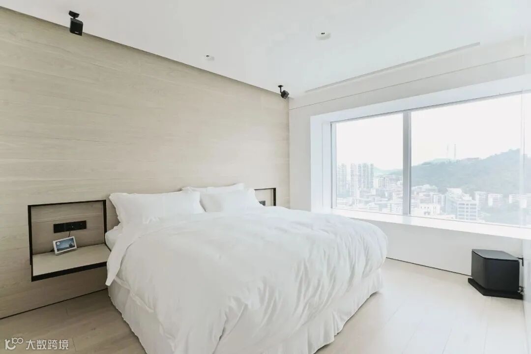 因为不太希望客人看得到私人空间,所以他把主卧和客房分布在L型的两边,完全封闭起来,找不到门在哪里。
