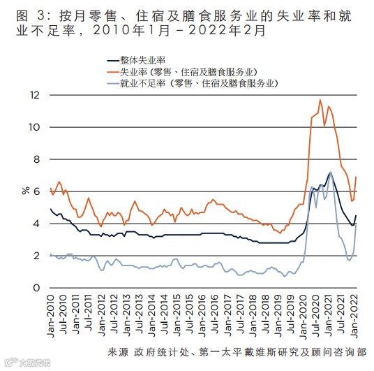 香港零售销货额数字在2月份回落,是香港零售市场自去年2月开始逐步回稳以来首次录得按月跌幅。本年1月和2月销售总额较去年同期下跌4.9%;与此同时,零售业的失业率及就业不足率亦分别从2021年12月的5.4%及1.9%上升至2022年2月的6.9%及3.9%。