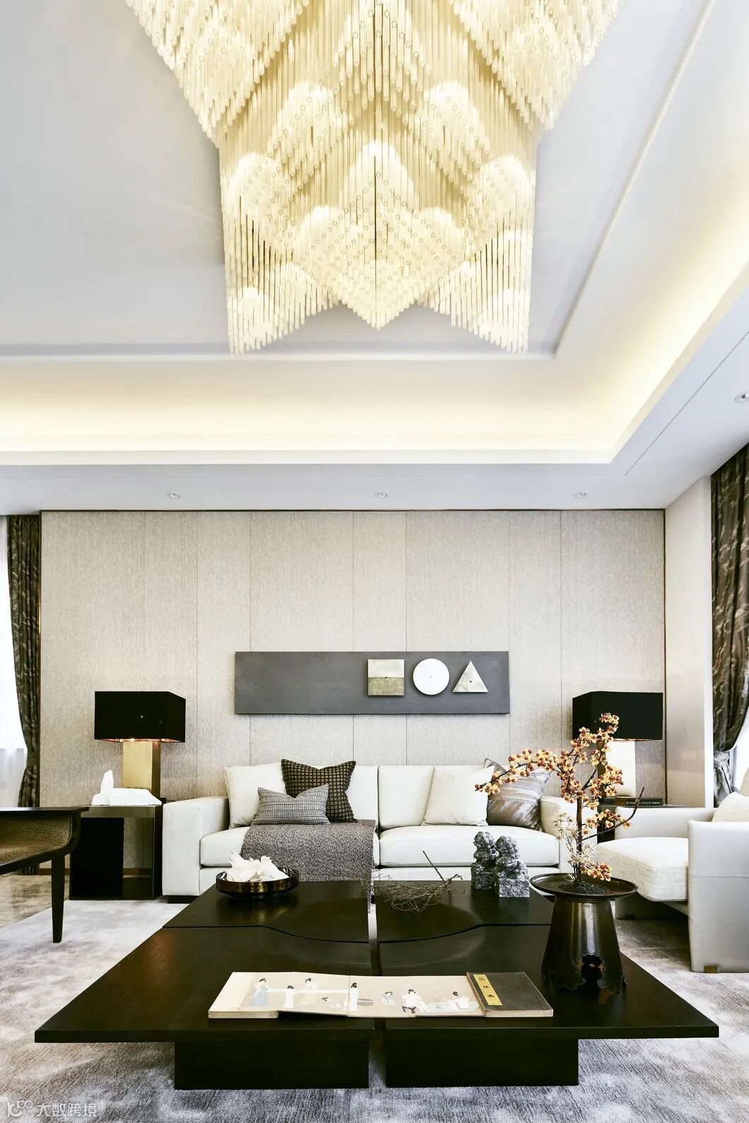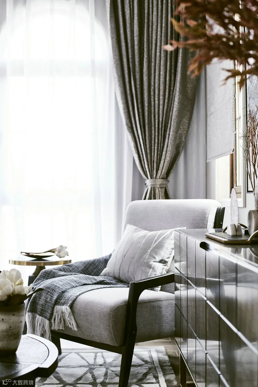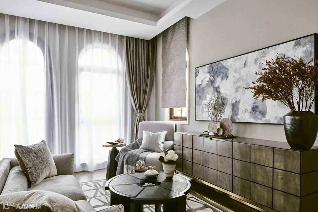 黑灰色窗帘纹路在空间中自然跳脱出来