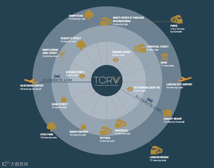TCRW Soho是在伦敦1区的Crossrail铁路线上建盖,该铁路线是耗资10亿英镑建造的首都交通基础设施升级工程的一部分,也是伊利莎白线与北线和中央线管道连接的交汇处。这个重要的交汇站将让项目的住客能够在短时间内轻松地连接伦敦的地铁,铁路和DLR网络,畅游市内各区。全新的横贯铁路将通往伦敦希思罗机场的行程从53 分钟缩短至28分钟。居民还可以分别在2分钟,5分钟和5分钟内到达邦德街,利物浦街和帕丁顿,并在12分钟内到达金丝雀码头。