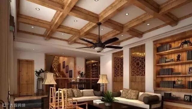 木条相交成方格形,上覆木板做成天花。也可以做成简单的环形灯池吊顶,实木做框,层次清晰。