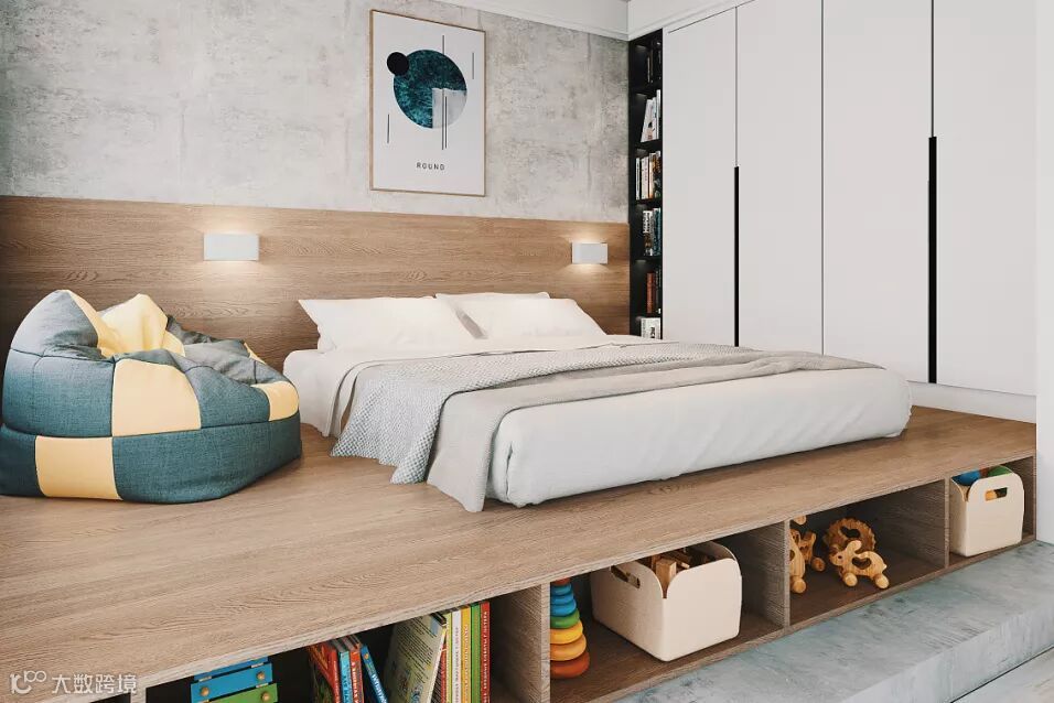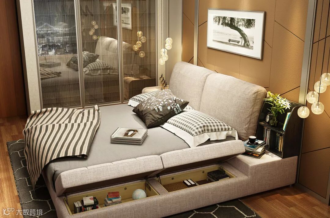 它打破了垂直空间收纳的惯例,实质相当于躺着放的柜子,其内部有很多分格的独立储存空间,外侧的抽屉,床面下的储物柜等等,都具有强大的收纳功能,让整个空间更加干净整洁,使家居的每一寸空间都发挥出价值。