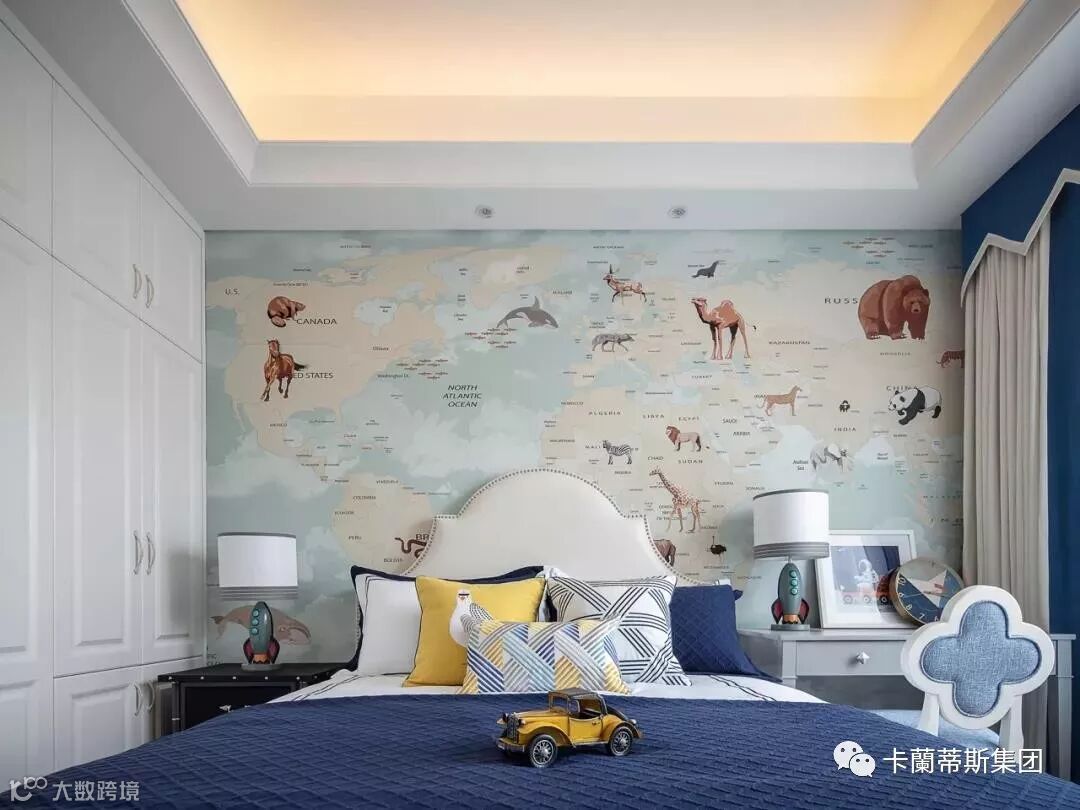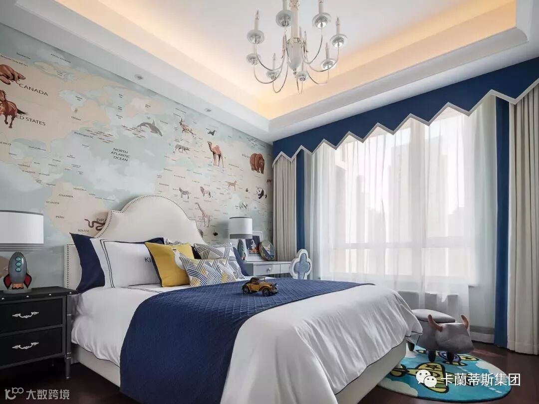 但所用的蓝色更偏男子汉气概,窗帘、床品、抱枕都用的是深蓝色。