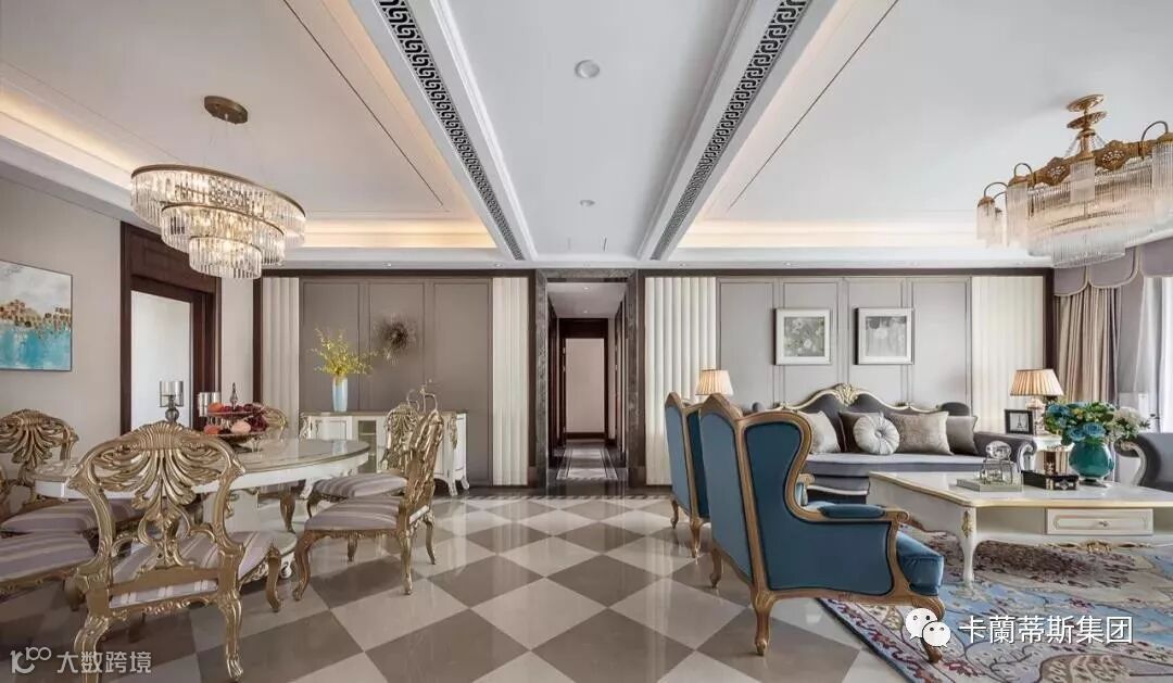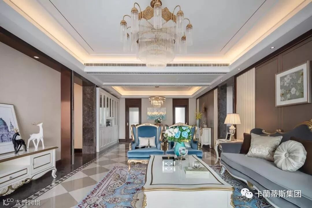 吊顶、吊灯将客厅与餐厅很好地做了一个区分,使用辅色的蓝不尽相同,不会让人产生审美疲劳。