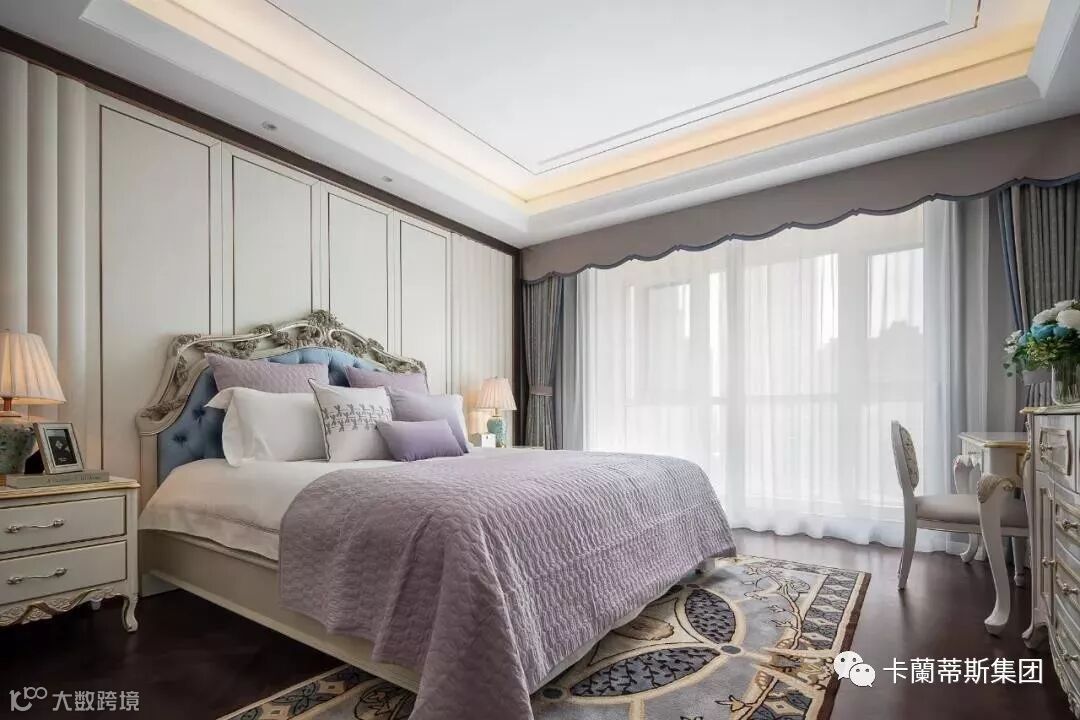 在主卧的色调上,除了延用客厅的配色外,又在此基础上增加了一点淡紫色。
