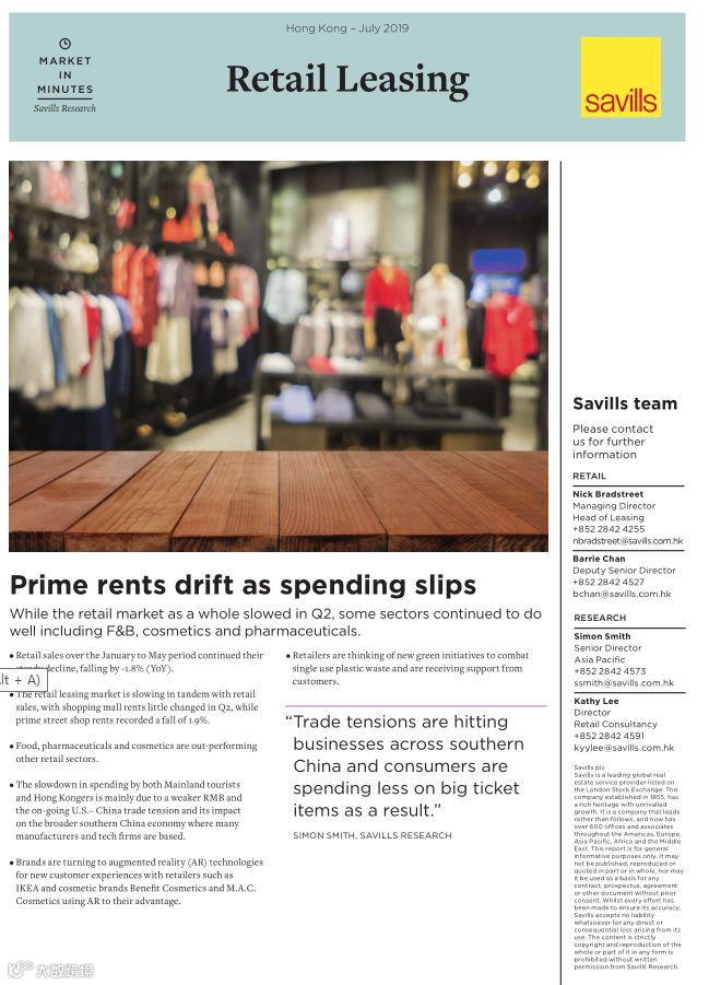 第一太平戴维斯发布零售租赁报告,指第二季度本港零售增长放缓,令零售租金“原地踏步”。其中商场租金变化不大,而优质街铺租金则按季下跌1.9%。食品、化妆品、药品5月销售额同比增长3.1%及1%,表现优于服装、奢侈品等板块。一太预计2019年下半年零售市场将保持平静,大交易或较为鲜见。