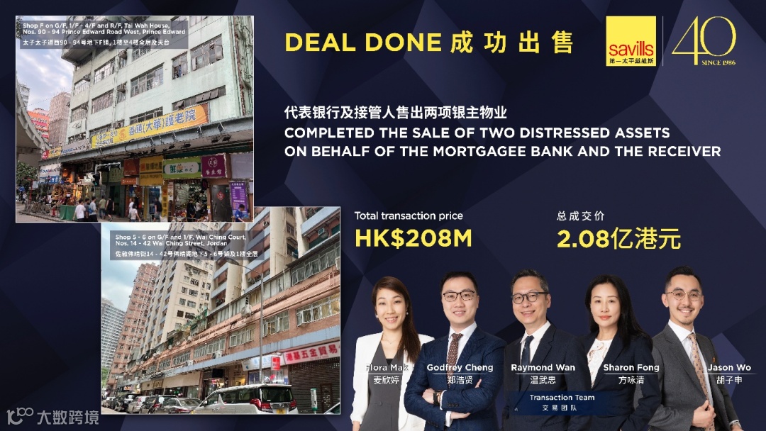 第一太平戴维斯成功代表银行及接管人促成两项银主盘物业交易。物业包括位于太子太子道西 90–94 号的地下 F 铺、1至4楼全层及天台,以及位于佐敦伟晴街14–42号伟晴阁的地下5–6号铺及1楼全层。