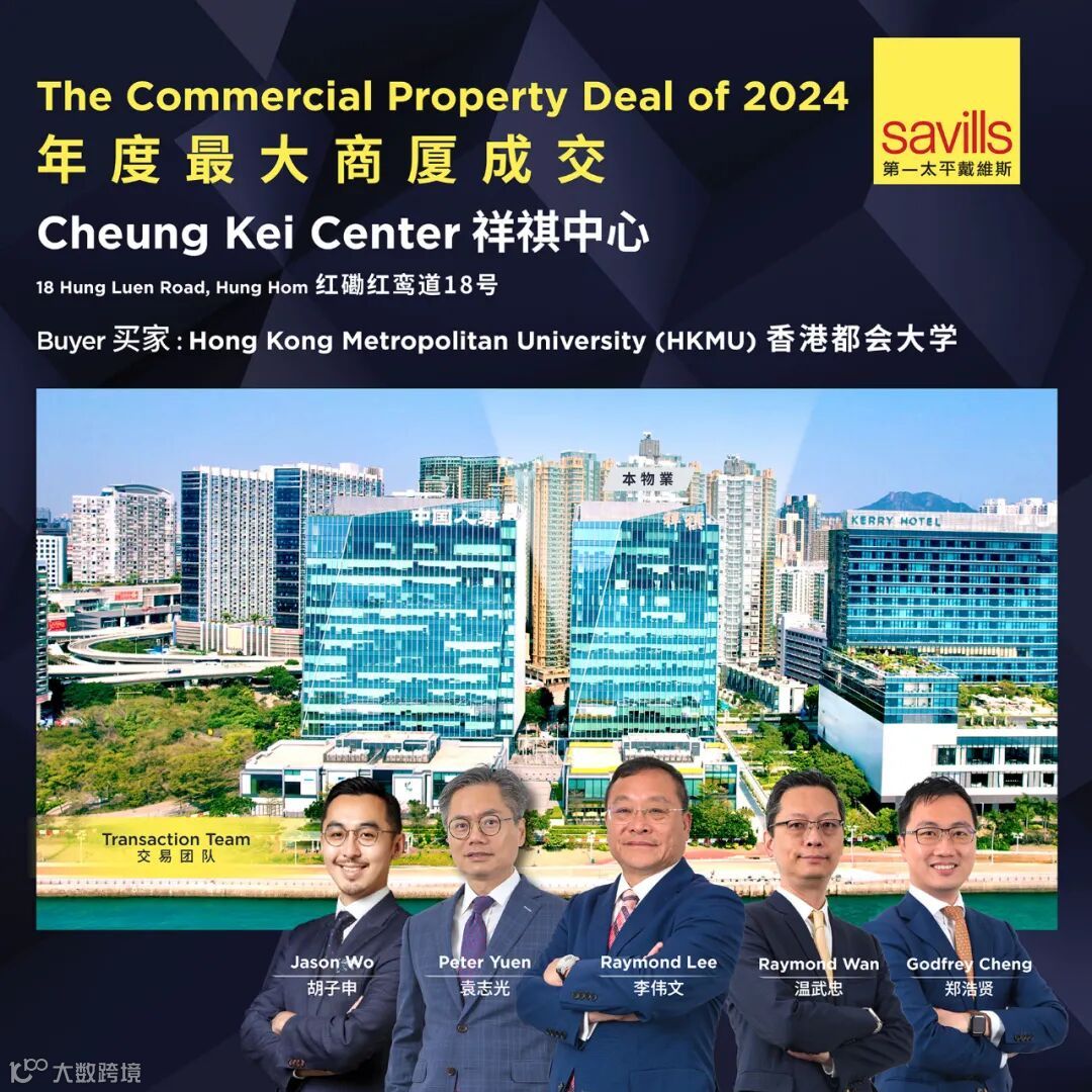 国际房地产顾问第一太平戴维斯成功促成2024年市场最大额商厦交易,物业为九龙红磡红鸾道18号祥祺中心(下称「物业」)交易,作价约26.5亿港元,买家为香港都会大学。