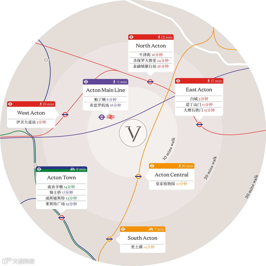 除了这一站,从项目出发步行10分钟或12分钟,还可以分别来到位于Overground伦敦地上铁的Action Central阿克顿中央站,或位于伦敦地铁Central Line中央线的North Acton北阿克顿站,满足更多出行需求。