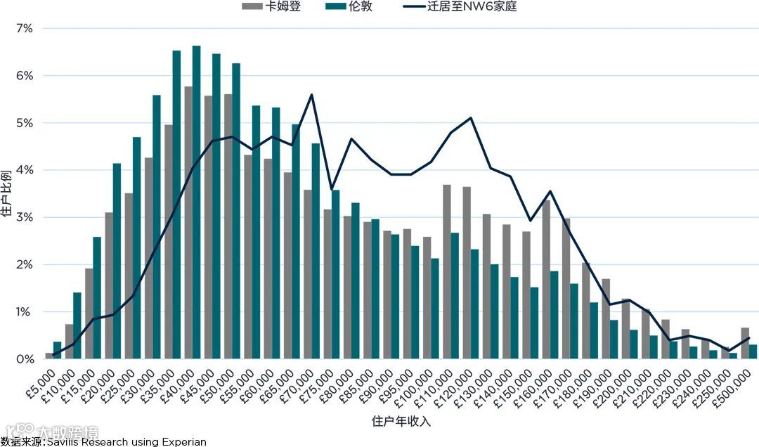进一步对比数据更不难发现,年收入5万-15万镑家庭迁居至NW6邮编地区的比例,明显超出该收入群体的伦敦住户占比▼