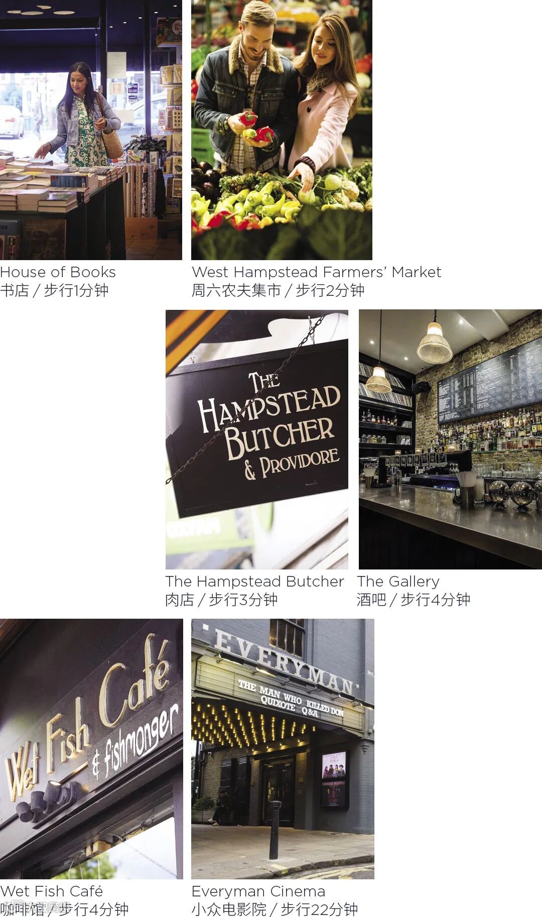 项目所在的West End Lane是西汉普斯特德最繁华的街段。在Lola's Bakery买一份新鲜出炉的手工烘焙甜品,在Tannin & Oak.预约一桌晚餐和好友相聚,看一场电影,读一本闲书;每周六还有属于西汉普斯特德自己的农夫集市,带来真正的有机农产品。