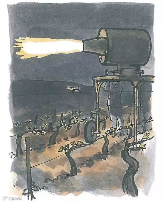 霜害防治:上图不是星际大战,而是一个安装在拖引机上的瓦斯喷火炉,当气温下降到冰点以下时,就可能需要出动这样的设备来防护葡萄树免于霜害。酒农们也可以采用其他防护办法,包括灌水(让葡萄树芽的表面上结一层冰)、传统的可移动式小煤气炉、加热式管线、以及使用大型风扇甚至直升机来吹散凝聚的冷空气。
