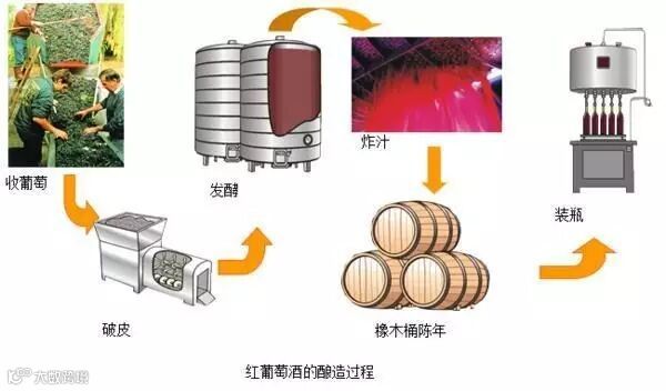 这里简要说明一下葡萄酒酿制过程。首先,葡萄采摘下来后,要经压榨除梗,糖分才释放到果汁中。