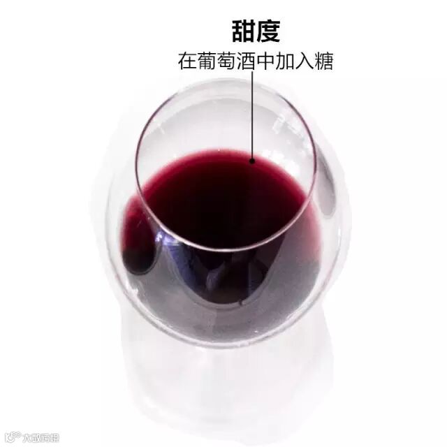 在葡萄酒中加入少量的糖,并不会感受到太多的甜味,却能增加葡萄酒的果味和余味的油脂感。你可以在舌尖感受到大部分的甜味,在你咽下葡萄酒后,在舌头中后部有粘质油脂感。