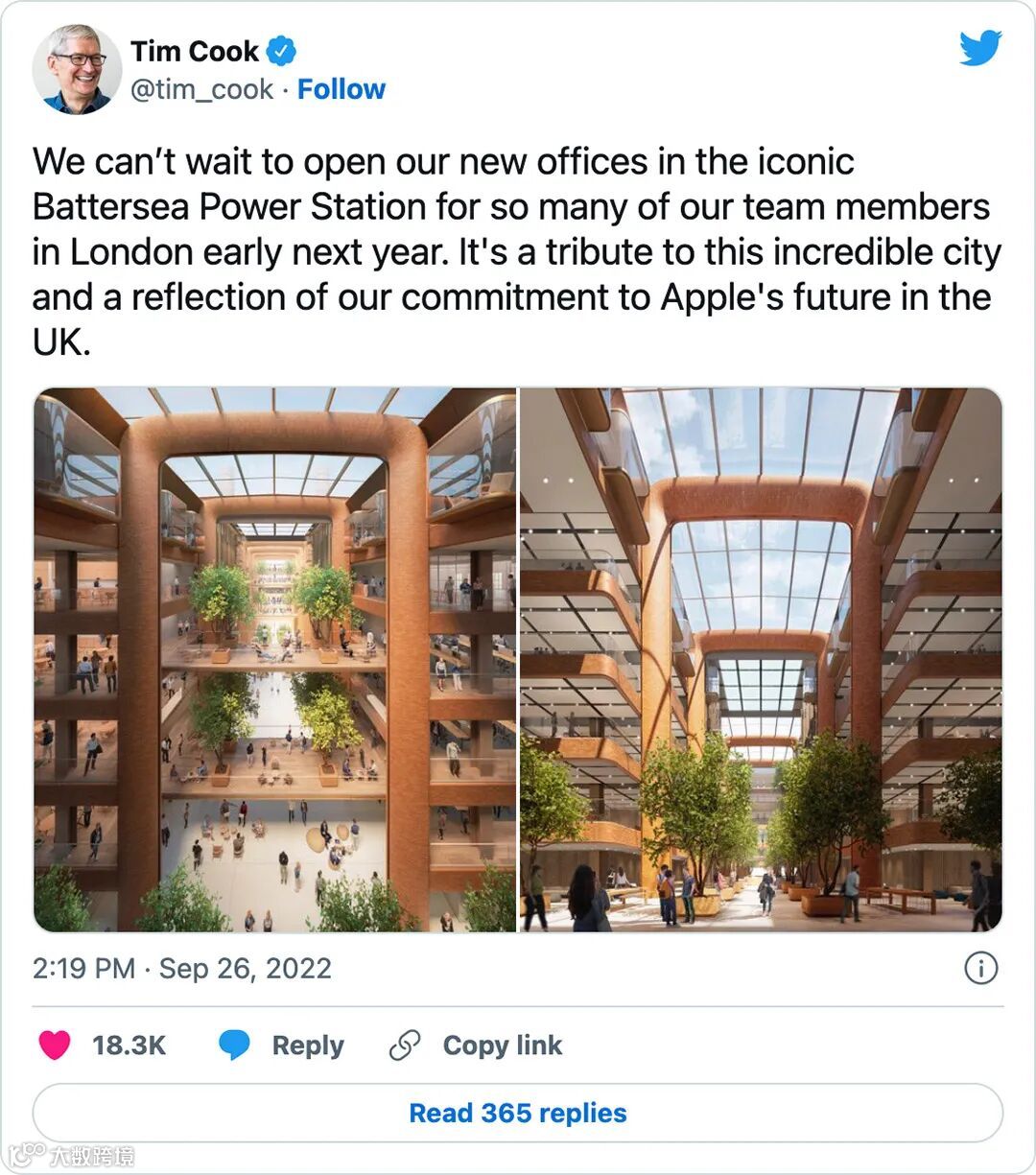 就连苹果现任CEO蒂姆·库克也在9月底前来伦敦的时候,专程去探访了巴特西电站中的英国全新苹果总部办公室,开开心心蹭了个热点:预计明年初新总部就会投入使用了,开心!