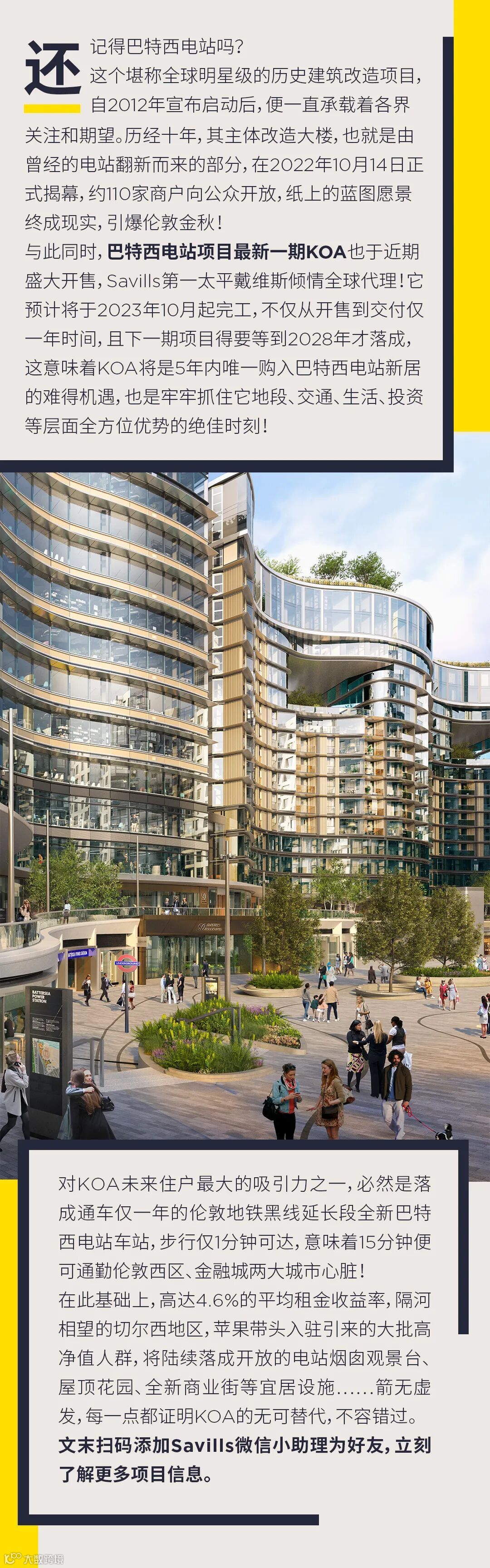 为什么这么说呢?一方面,KOA本身预计2023年10月起落成,意味着从开售起约一年内即可交付,在伦敦高端新建住宅期房中难能可贵;另一方面,巴特西电站四期预计2024年开售、2028年完工,也就是说从KOA到下一批可购住宅之间,将有整整5年的投资空窗期!