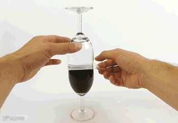 首先,用两个规格一样的酒杯,分别将红酒和清水倒入里面。用一块塑胶覆盖在倒入清水的酒杯上,然后将它翻转并且盖在红酒杯上。之后,当他拉走这块塑胶后,我们可以惊奇的发现底下的红酒竟然开始慢慢地渗透到上面的酒杯中。