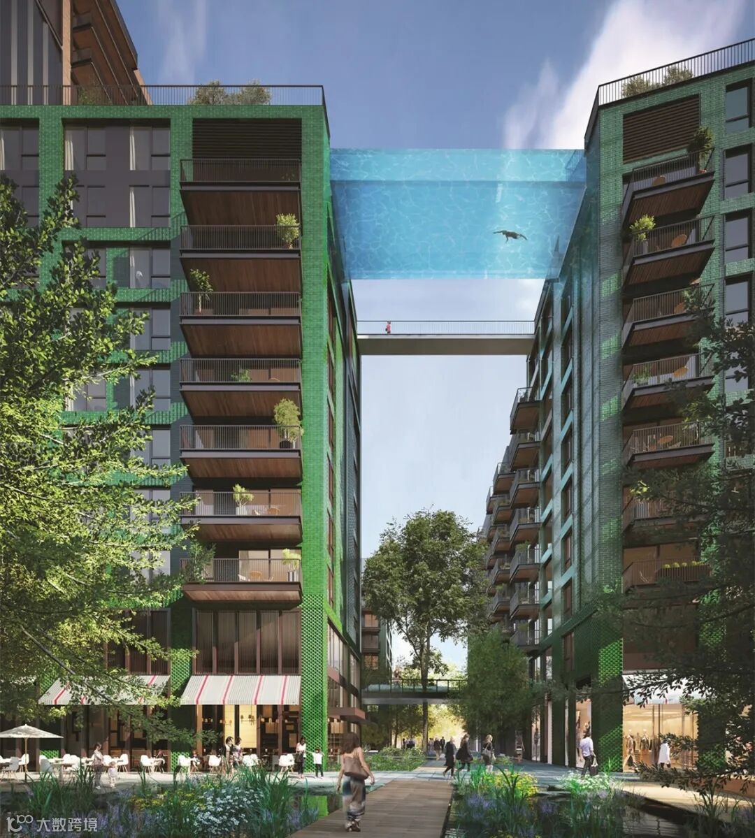 Embassy Gardens最具标志性的是天际泳池(Sky Pool)和天际阳台(Sky Deck)。这个水晶般清澈的丙烯酸天池介于两栋住宅之间。顶楼天台的“天幕”空中泳池横跨两座建筑之间,形成无可比拟的城市风景线。使您可以在城市上空游泳,并在整个池壁上欣赏全景。Sky Deck是带私人酒吧的屋顶绿洲,为忙碌的伦敦生活提供恬静的休息空间。
