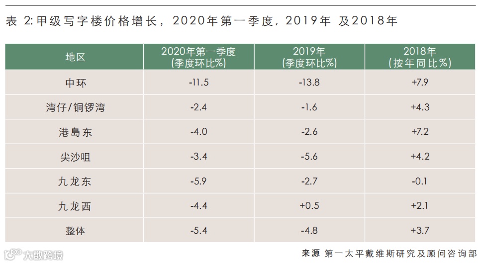 2020年第一季度,中环甲级写字楼平均价格跌幅最大,达11.5%。全港整体市场的跌幅则较为温和,为4.1%。与写字楼投资者相比,零售物业投资者正寻求更大折扣(较之前最高价折让30%至50%),惟较少商铺业主愿意配合。