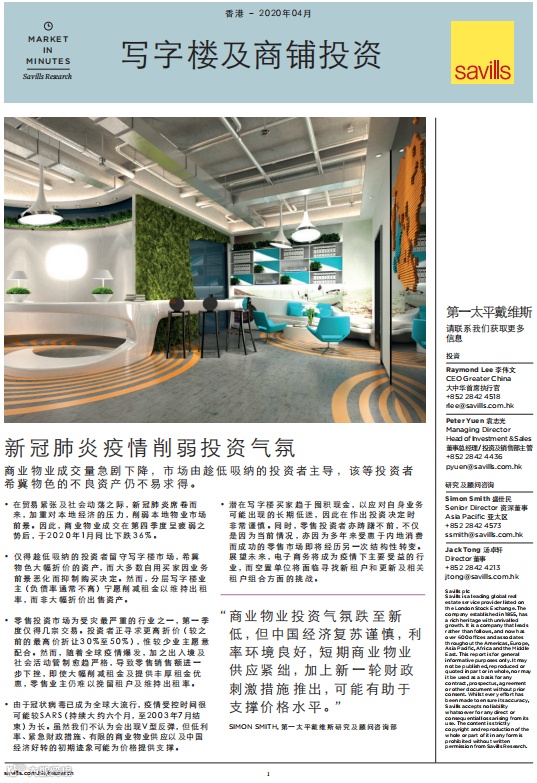潜在写字楼买家目前囤积现金,以应对自身业务可能面对的动荡,因此在作出投资决定时非常谨慎。同时,商铺投资者亦踌躇不前,不仅是因为当前情况,亦因为多年来受惠于内地消费而成功的零售市场即将经历另一次结构性转变。展望未来,电子商务将成为疫情下主要受益的行业,而空置单位将面临寻找新租户及更新及相关租户组合方面的挑战。