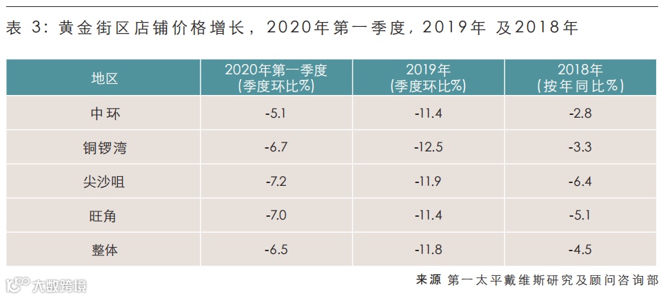 黄金地段街铺价格于2020年第一季度下跌6.5%,又以尖沙咀及旺角这两处最受内地游客欢迎的购物区跌幅为显著。