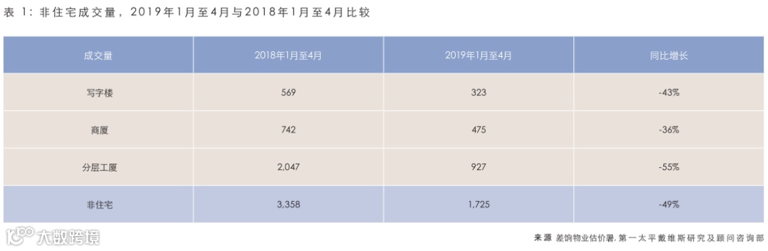中美贸易局势紧张,加之逃犯条例以及所衍生的动荡令投资气氛受挫,主要非住宅成交(逾1亿港元)于2019年首五个月同比下跌50%,许多投资者仍持观望态度。整体非住宅成交量于今年首四个月亦近乎“腰斩”,大跌49%,为自2016年美国联储局首次加息以来的最差开局。