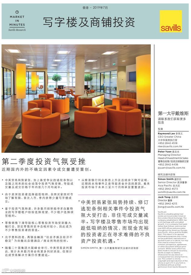 “中美贸易紧张局势持续、修订逃犯条例相关事件令本港投资气氛大受打击,非住宅成交量减半。写字楼及零售市场均出现趁低吸纳的情况,而现金充裕的投资者正在寻求难得的不良资产投资机遇。”