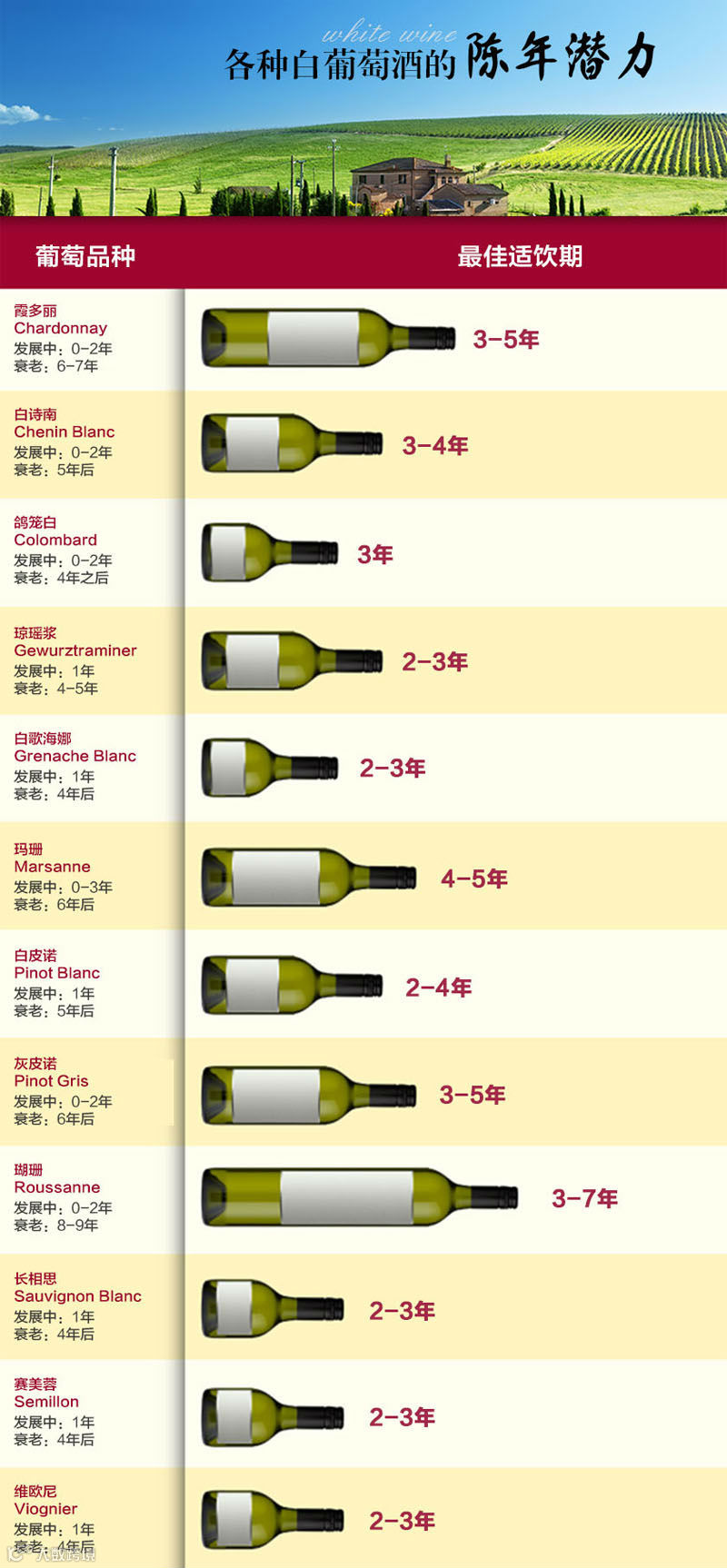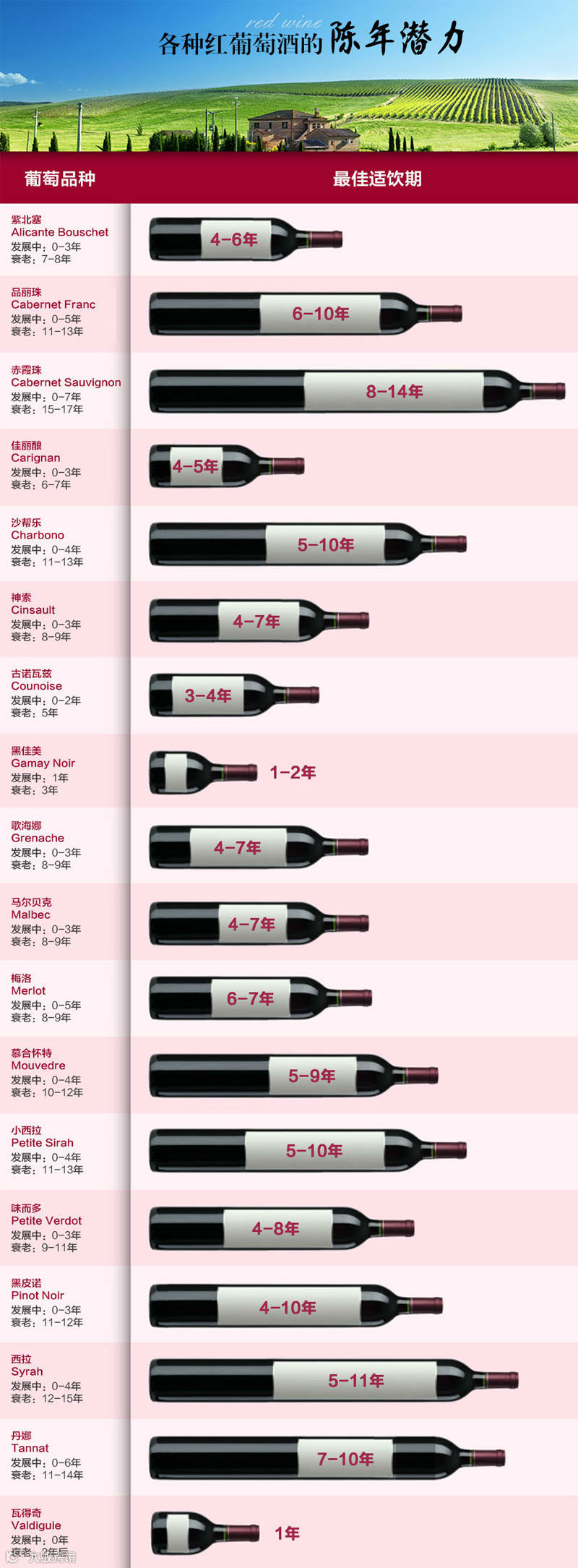 在此看来,谈论葡萄酒不应该谈论保质期,而应该像外国人一样谈论最佳适饮期。葡萄酒是有生命的,与人一样,葡萄酒的生命会经历从年轻、发展、成熟、顶峰和衰落的过程。一般来说,葡萄酒在其生命的顶峰时期饮用是最好的。那么,顶峰时期又是什么时候呢?这要依据不同的葡萄酒而定。以下为常见红葡萄酒和白葡萄酒的适饮时间,可以作为参考。