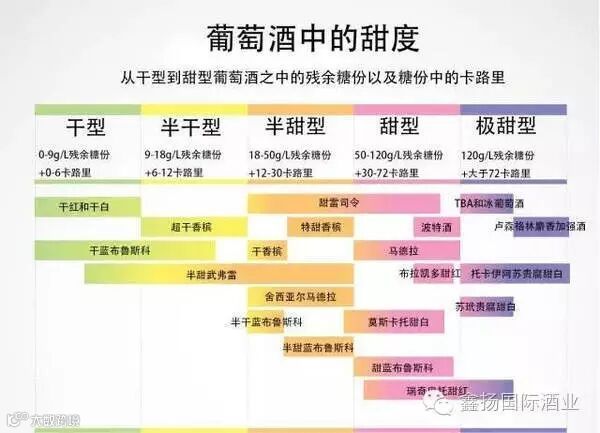 首先,我们得知道一个术语——剩余糖份。我们知道,在发酵过程中,酵母会把糖分转化为酒精。而在发酵完成后,成酒中没被酵母转化成酒精的残留下来的糖分就是剩余糖份。一般以每升葡萄酒中含有多少克糖(g/L)来表示。在这里,需要说明一下:从干型到甜型的葡萄酒的分类,并非是全世界统一的标准,各个国家略有不同。如在美国,他们有时将剩余糖份是 10g/L 的葡萄酒也称为干酒。