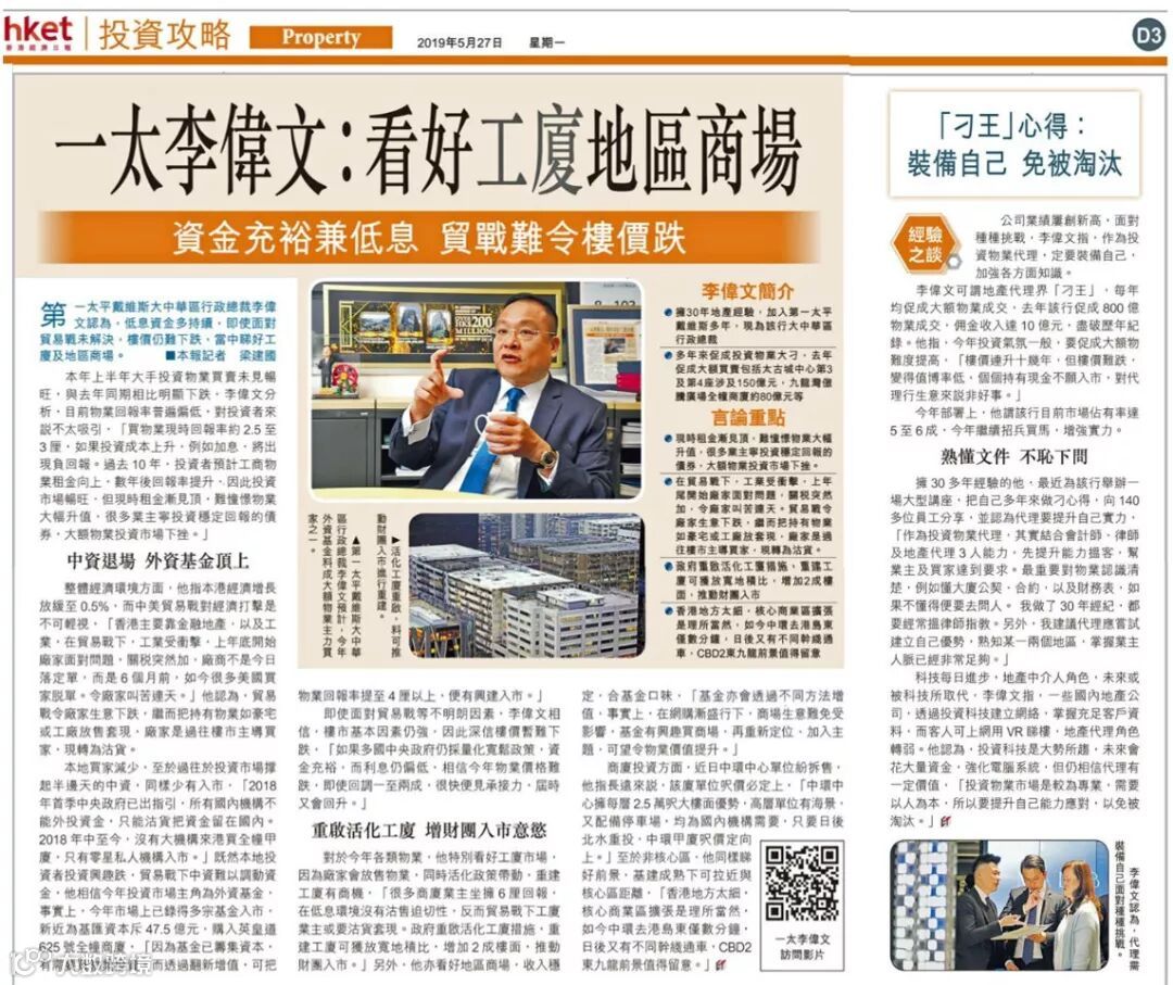 对于今年各类物业,李伟文先生特别看好工厦市场,因为厂家会放售物业,同时活化政策带动,重建工厦有商机,很多商厦业主坐拥6厘回报,在低息环境没有沽售迫切性,反而贸易战下工厦业主或要沽货套现。政府重启活化工厦措施,重建工厦可获放宽地积比,增加2成楼面,推动财团入市。
