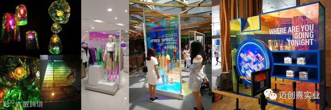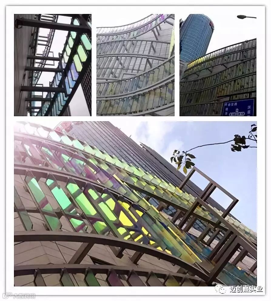 炫彩玻璃是使用超白玻璃原片在表面加工镀彩、玻璃与玻璃之间夹炫彩玻璃膜和3M炫彩玻璃贴膜工艺而制成的产品三种工艺的产品,不同角度下可以呈现不同的颜色。