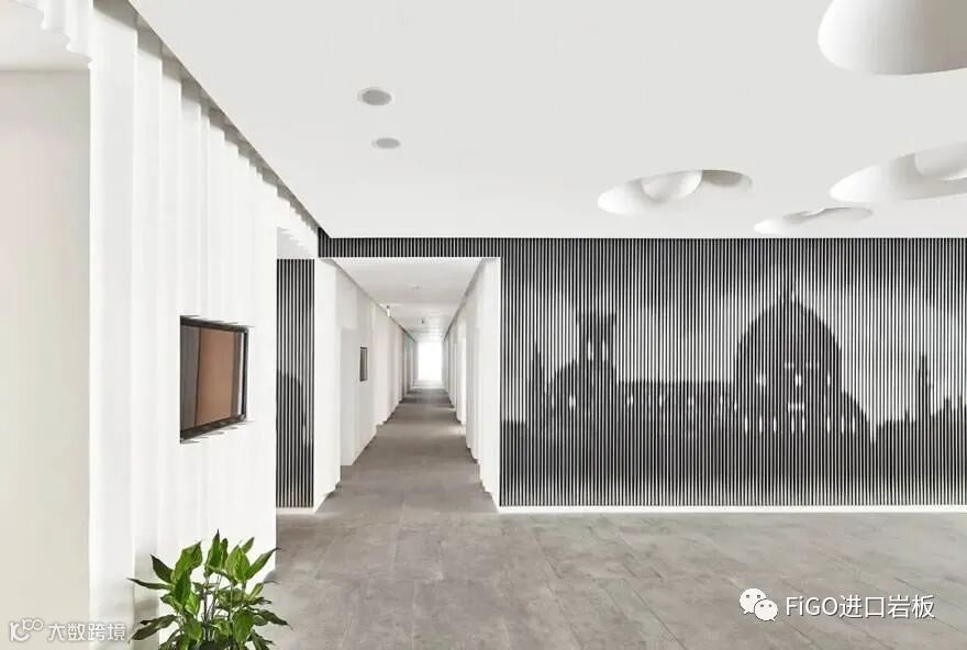 楼层保留了原本的基本平面布局,在室内门厅的东西两面墙上,设计了石膏板装饰条,搭配沉稳大气的Porcelaingres品牌象牙色瓷砖,通过装饰条的虚实变化代表性地勾勒中意两国地标建筑的天际线,寓意传承融合中意两国标志性的文化,让中意学院的文化交流意境更加深远。
