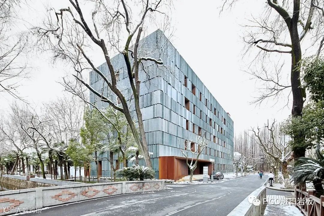 在外立面上,设计师通过改变立面材料的肌理来增加新建筑外观的「可阅读性」,选用了多种不同的波浪形装饰混凝土板,形成渐变效果。新的混凝土表皮与老建筑的窗口通过钢板营造的窗框联系在一起,突出立面的立体感,打破过於规整的立面空间格局。绿色的主题也在外立面上得到很好的体现,屋面景观亭上部覆盖光伏发电板,为运筹楼提供一部分电力。入口广场也更换了透水铺装,并收集屋面的雨水汇集于地下机房,经过处理后重新利用,用于冲厕和绿化浇洒。