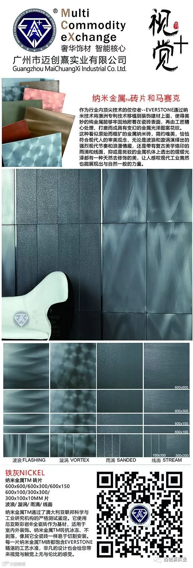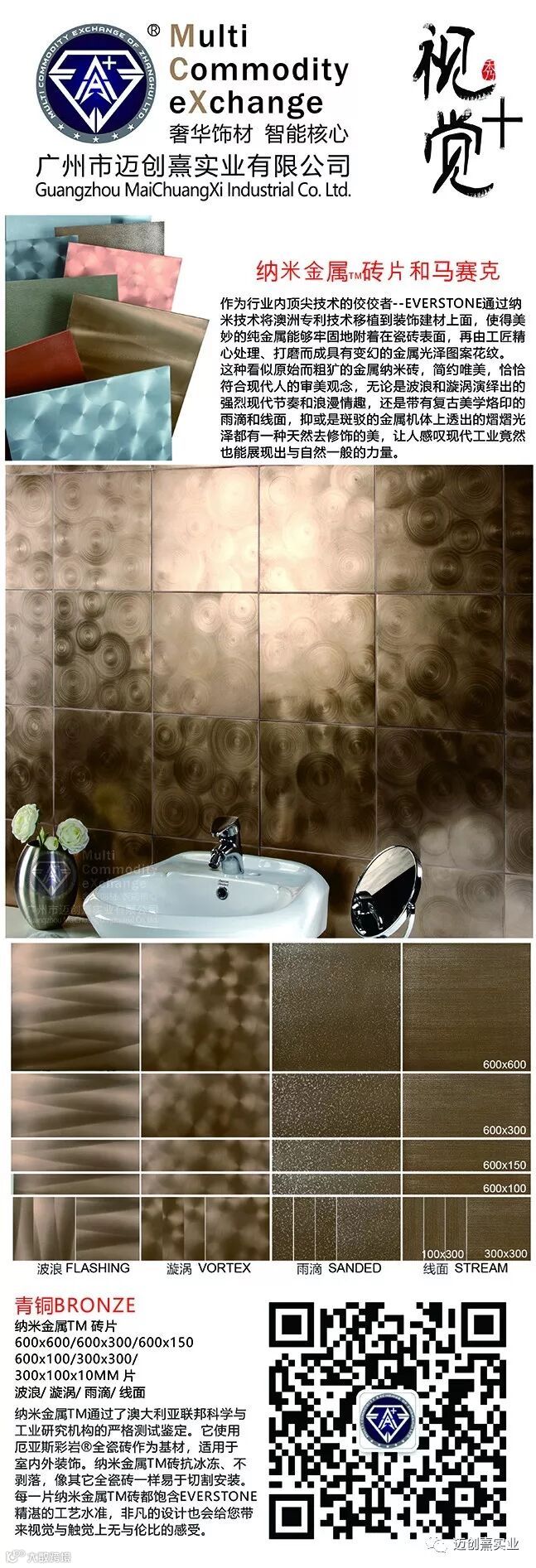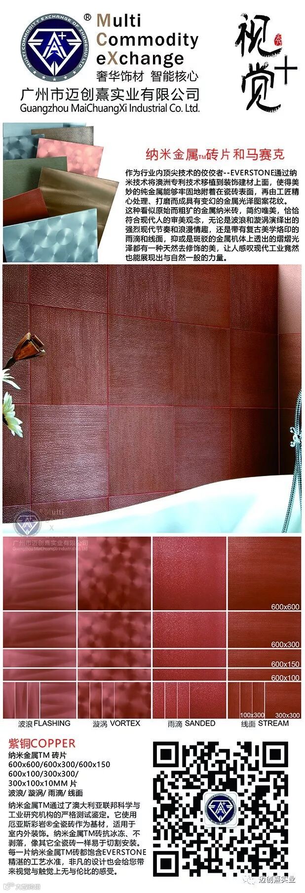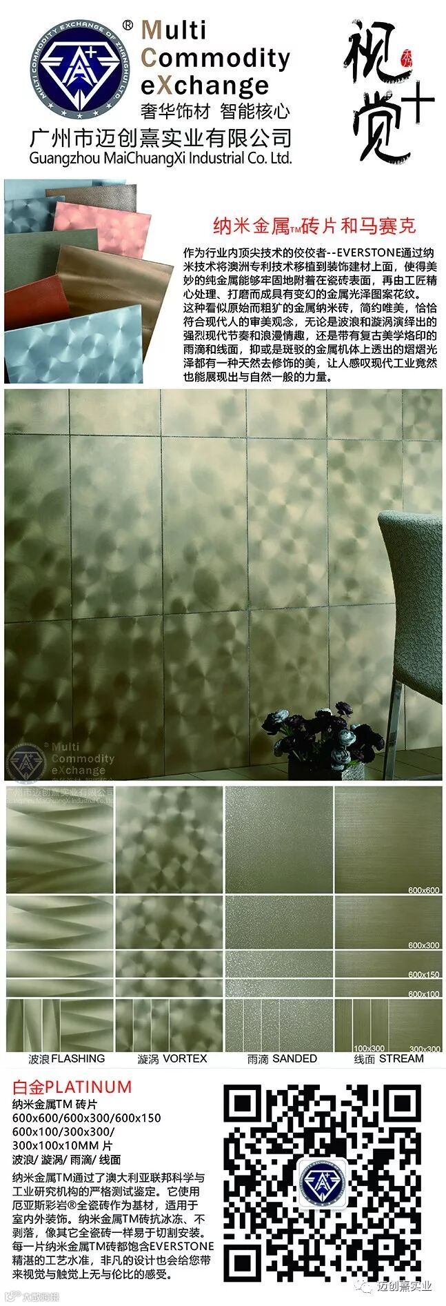 作为行业内顶尖技术的佼佼者--- EVERSTONE通过纳米技术将澳洲专利技术移植到装饰建材上面,使得美妙的纯金属能够牢固地附着在瓷砖表面,再由工匠精心处理、打磨而成具有变幻的金属光泽图案花纹。这种看似原始而粗犷的金属纳米砖,简约唯美,恰恰符合现代人的审美观念,无论是波浪和漩涡演绎出的强烈现代节奏和浪漫情趣,还是带有复古美学烙印的雨滴和线面,抑或是斑驳的金属机体上透出的熠熠光泽都有一种天然去修饰的美,让人感叹现代工业竟然也能展现出与自然一般的力量。
