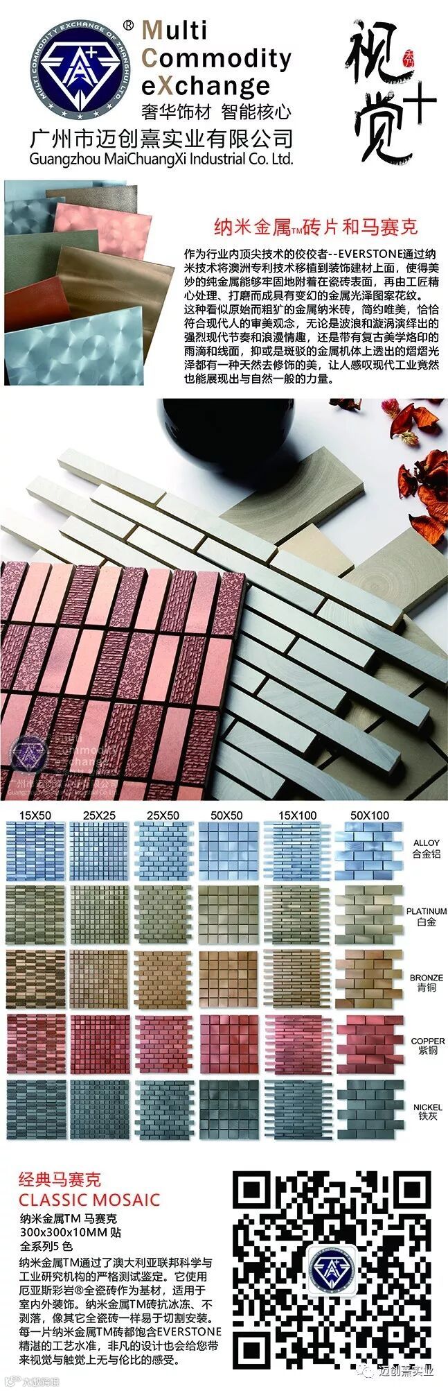 纳米金属通过了澳大利亚联邦科学与工业研究机构的严格测试鉴定。它使用厄亚斯彩岩®全瓷砖作为基材,适用于室内外装饰。纳米金属砖抗冰冻、不剥落,像其它全瓷砖一样易于切割安装。每一片纳米金属砖都饱含EVERSTONE精湛的工艺水准,非凡的设计也会给您带来视觉与触觉上无与伦比的感受。