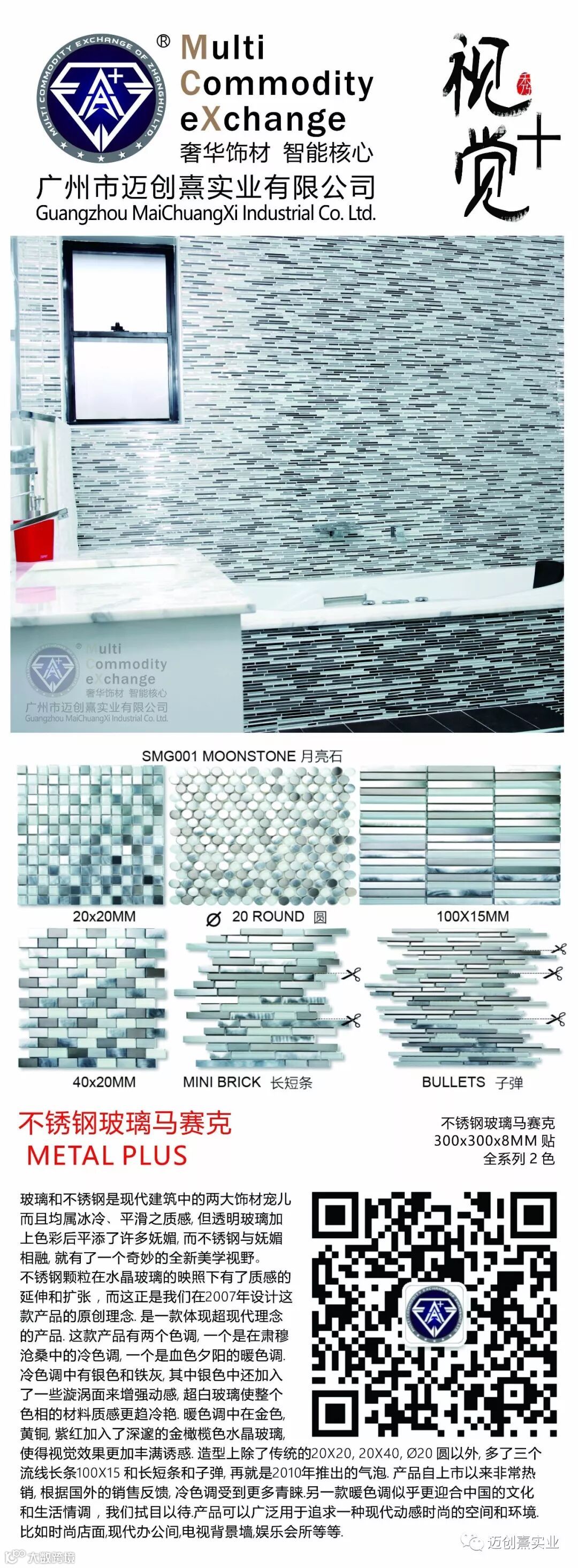 顾名思义 , 是将水晶玻璃和不锈钢混合的马赛克 . 玻璃和不锈钢是现代建筑中的两大饰材宠儿而且均属冰冷、平滑之质感 , 但透明玻璃加上色彩后平添了许多妩媚 , 而不锈钢与妩媚相融 , 就有了一个奇妙的全新美学视野。不锈钢颗粒在水晶玻璃的映照下有了质感的延伸和扩张,而这正是我们在 2007 年设计这款产品的原创理念 . 是一款体现超现代理念的产品 . 这款产品有两个色调 , 一个是在肃穆沧桑中的冷色调 , 一个是血色夕阳的暖色调 . 冷色调中有银色和铁灰 , 其中银色中还加入了一些漩涡面来增强动感 , 超白玻璃使整个色相的材料质感更趋冷艳 . 暖色调中在金色 , 黄铜 , 紫红加入了深邃的金橄榄色水晶玻璃 , 使得视觉效果更加丰满诱惑 . 造型上除了传统的 20X20, 20X40, Ø20圆以外 , 多了三个流线长条 100X15 和长短条和子弹 , 再就是 2010 年推出的气泡 . 产品自上市以来非常热销 , 根据国外的销售反馈 , 冷色调受到更多青睐 . 另一款暖色调似乎更迎合中国的文化和生活情调,我们拭目以待 .产品可以广泛用于追求一种现代动感时尚的空间和环境 . 比如时尚店面 , 现代办公间 , 电视背景墙 , 娱乐会所等等 .